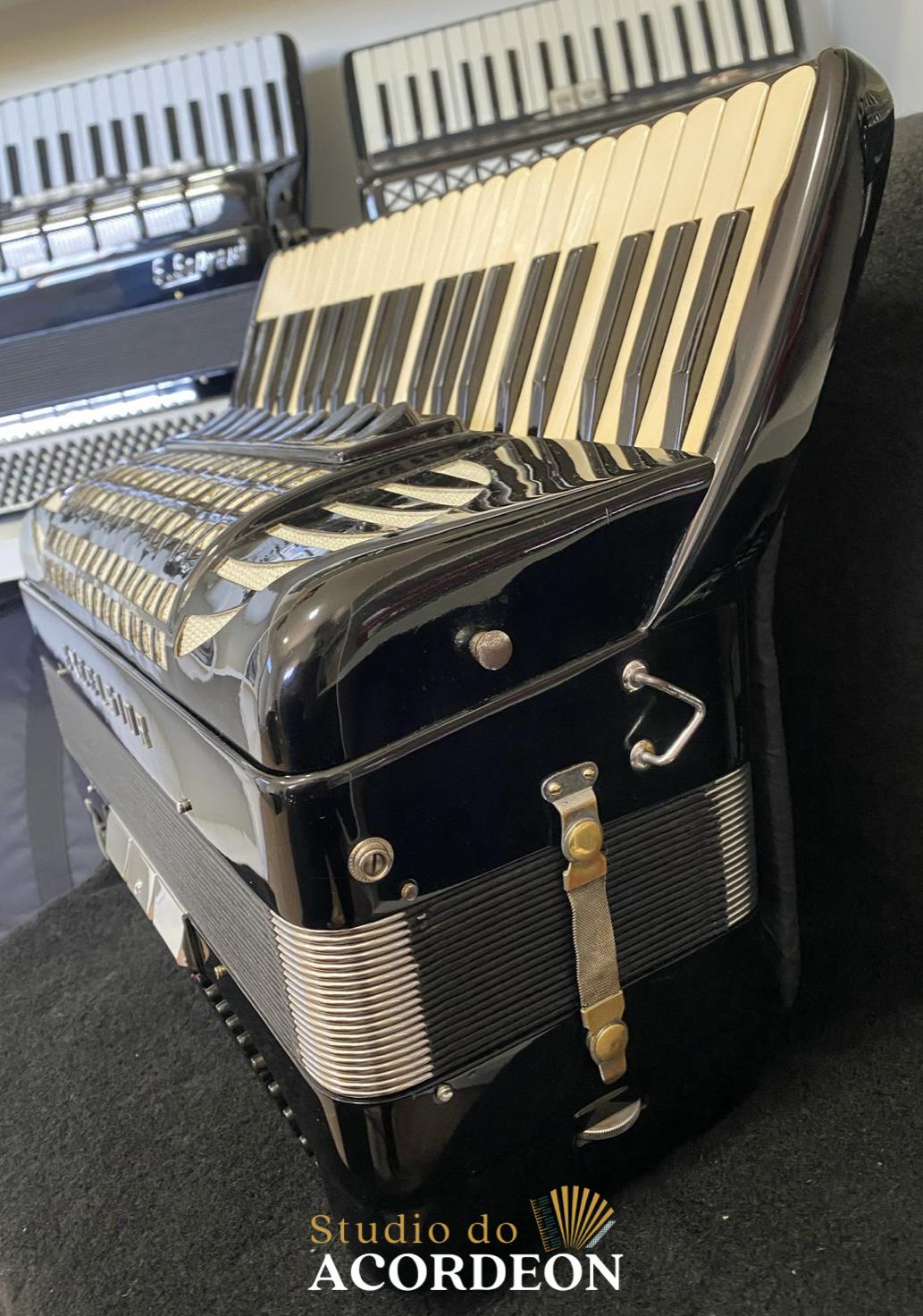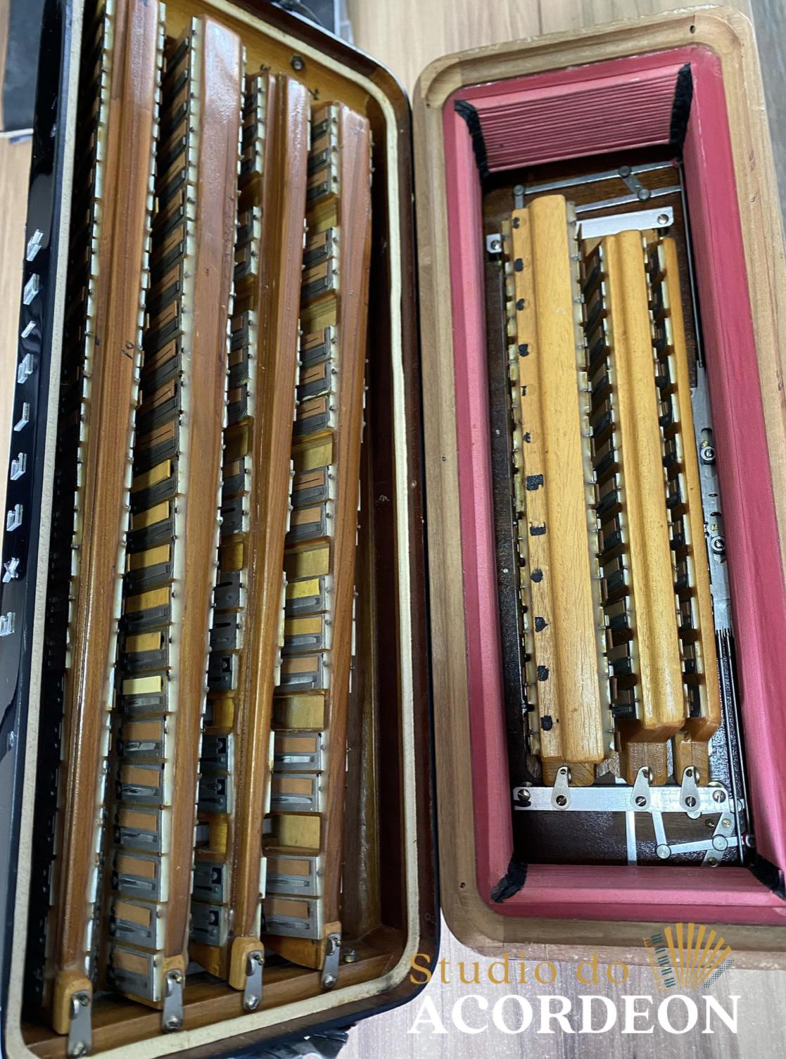 11/3 registros; 4/5 de voz Polifônica; Nunca furada com eletrificações; Teclado original marfim, tamanho profissional 48.5cm; 120 baixos; Desarme Lateral; 10.800kg aproximado; Timbre forte espetacular; Revisada fole e afinação 💯%; Alças e bag novo; Enviamos para todo Brasil; Parcelamento em até 12x com Acréscimo da operadora;