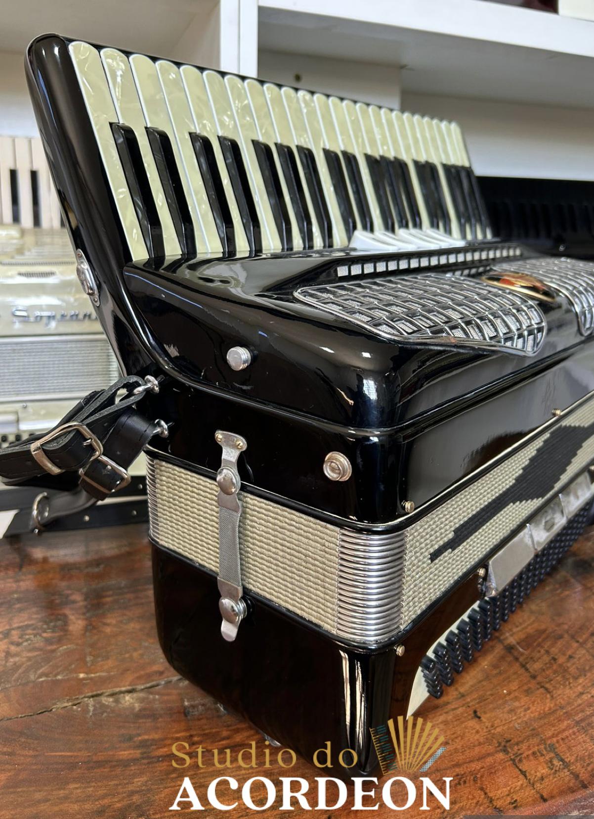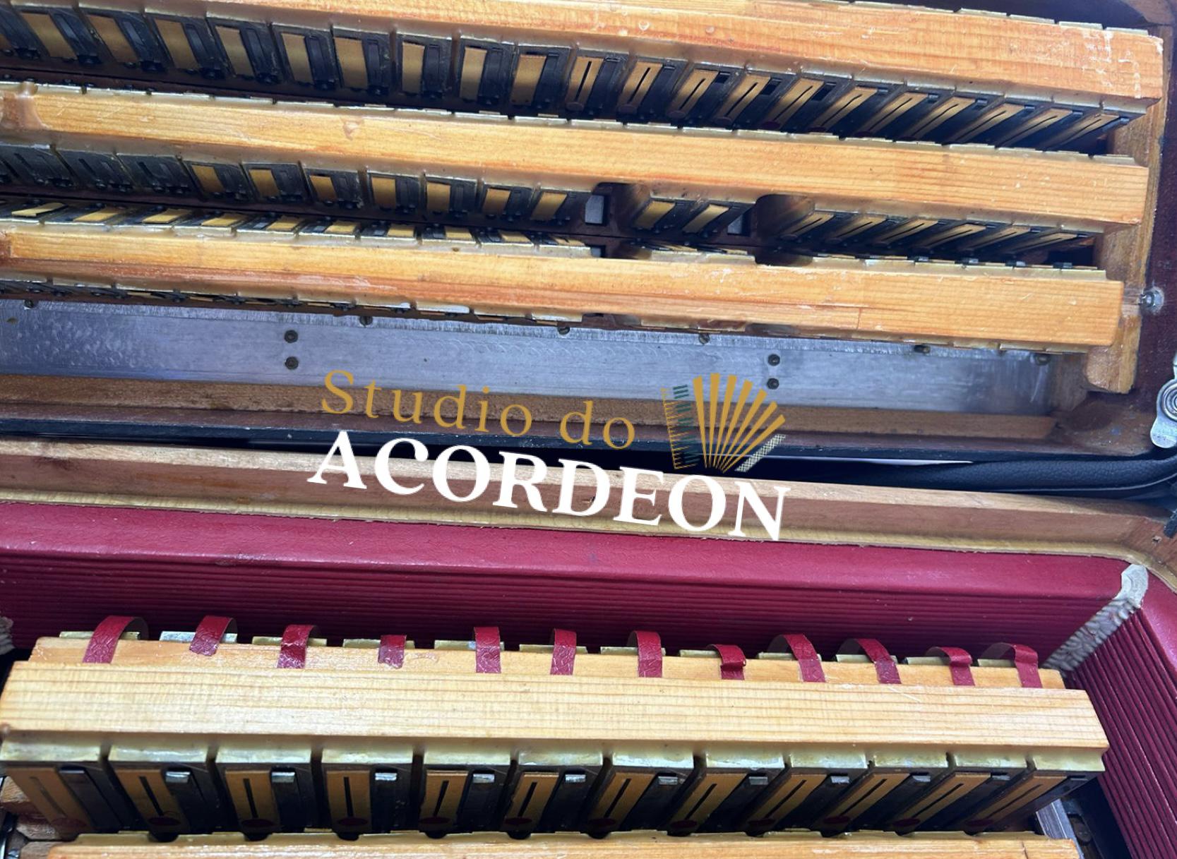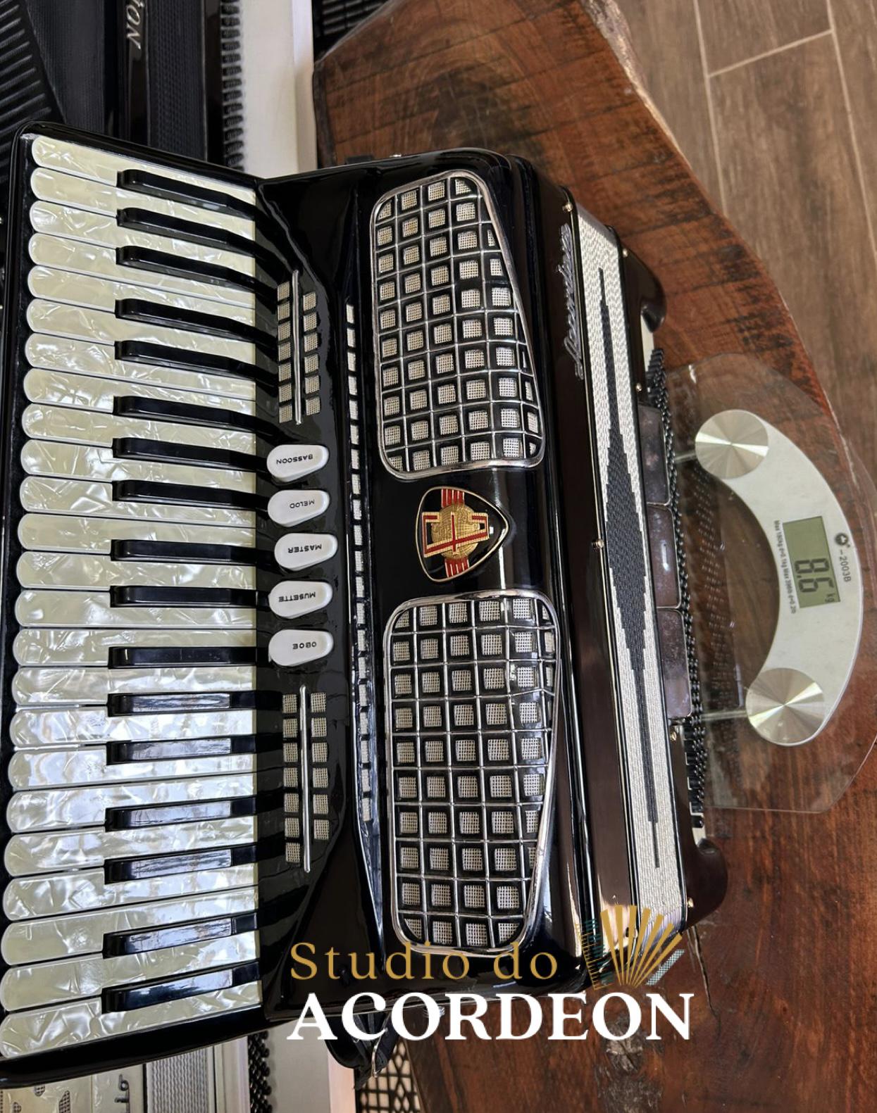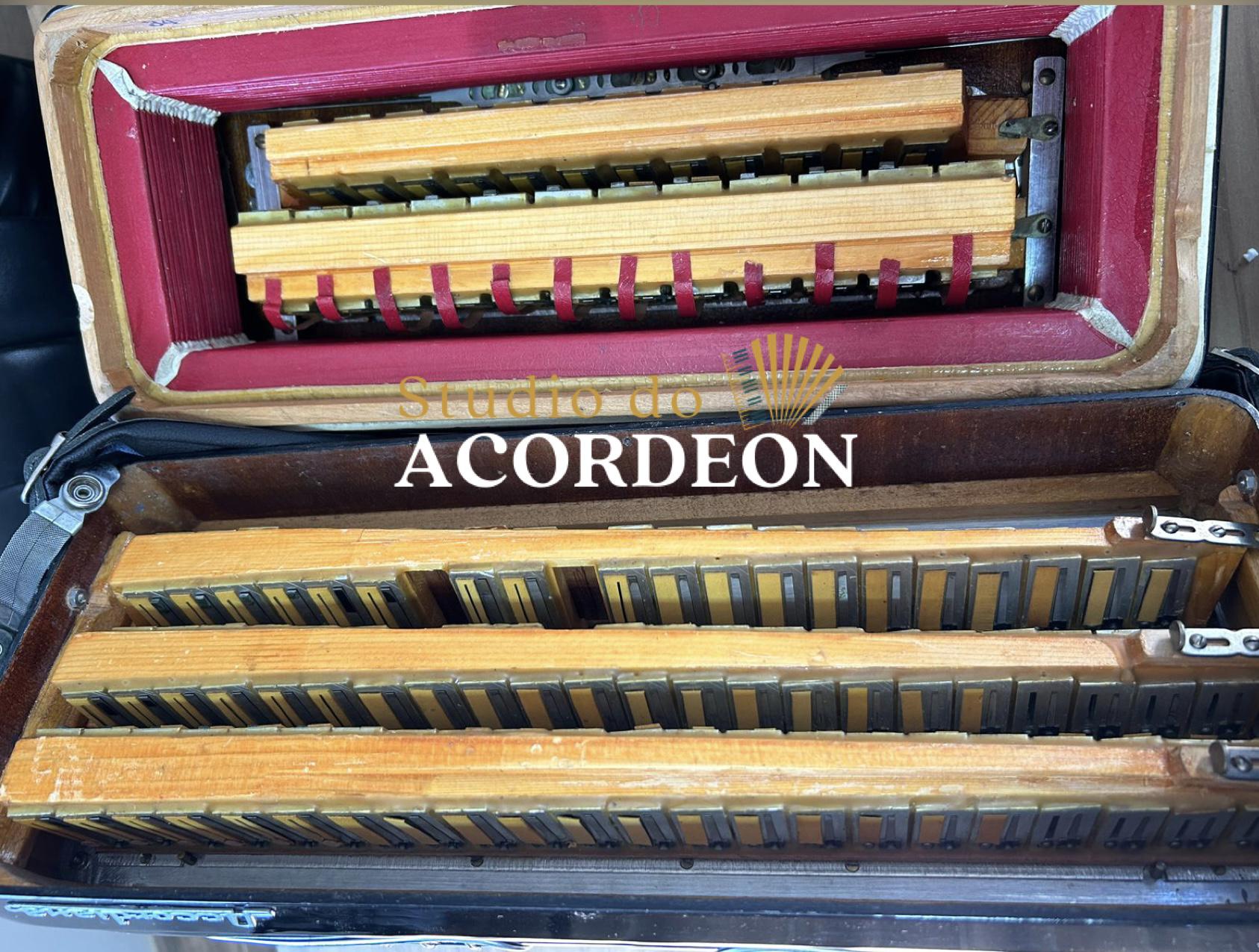 Terça de voz; Teclado madrepérola com 44,5cm; 5/3 registros; 120 baixos; Pressão de fole 💯 %; 8.600 kg; Alças de ombro e bag novo; Enviamos para todo Brasil🇧🇷; Parcelamento em até 12x nos cartões de crédito 💳