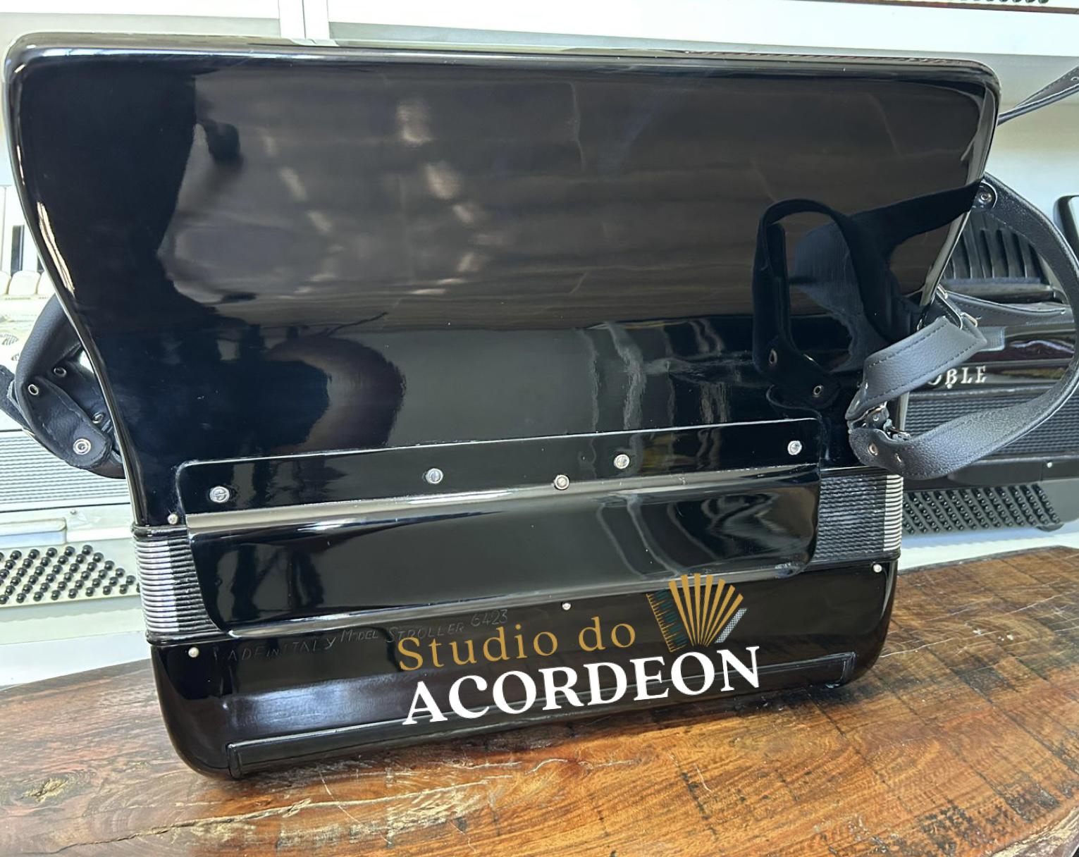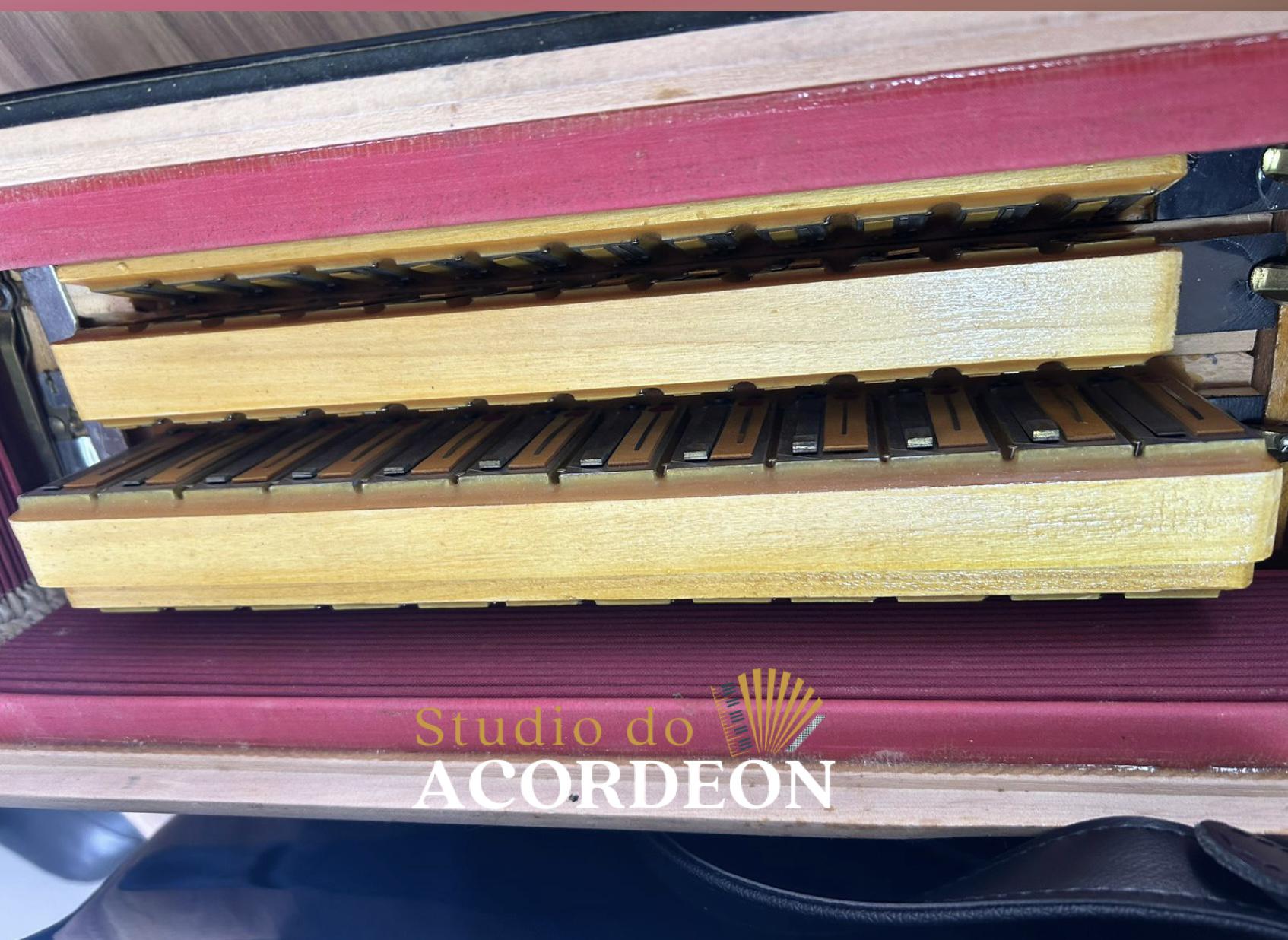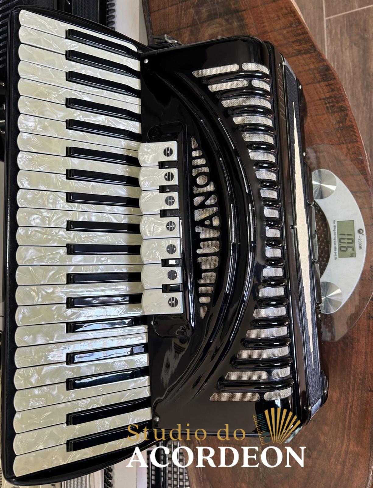 3/5 de voz; Teclado madrepérola com 47,5cm; 7/3registros; 120 baixos; Nunca furada com eletrificações; Instrumento chama atenção por sua originalidade, fechos de fole correia dos baixos e musicamento tudo ainda original; Protetor de fole rígido original; Pressão de fole e afinação💯 %; Fabricação Italiana; 10.6000kg; Alças de ombro e bag novo; Enviamos para todo Brasil🇧🇷; Parcelamento em até 12x nos cartões de crédito 💳
