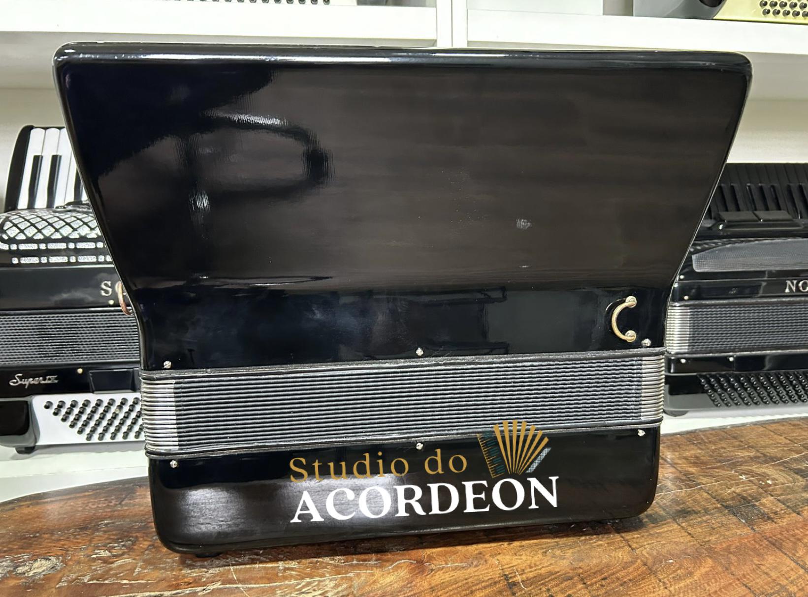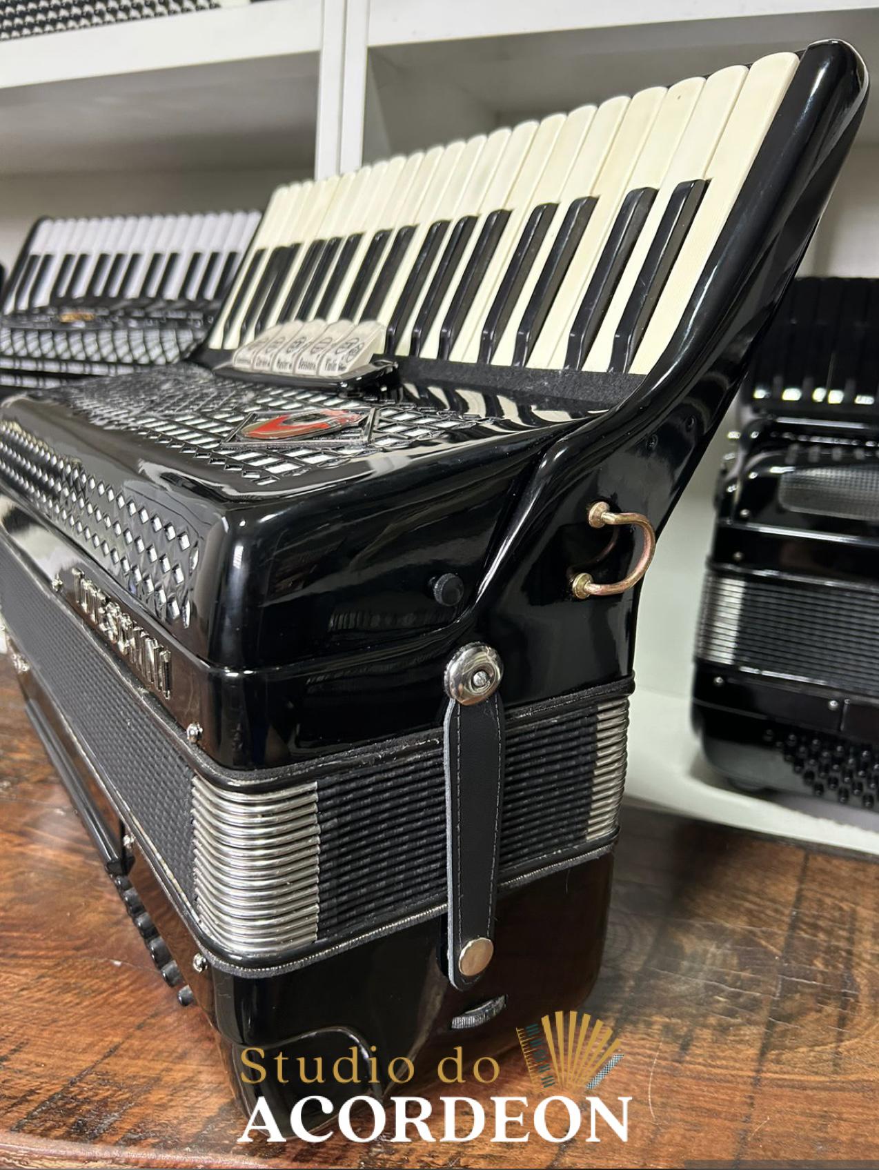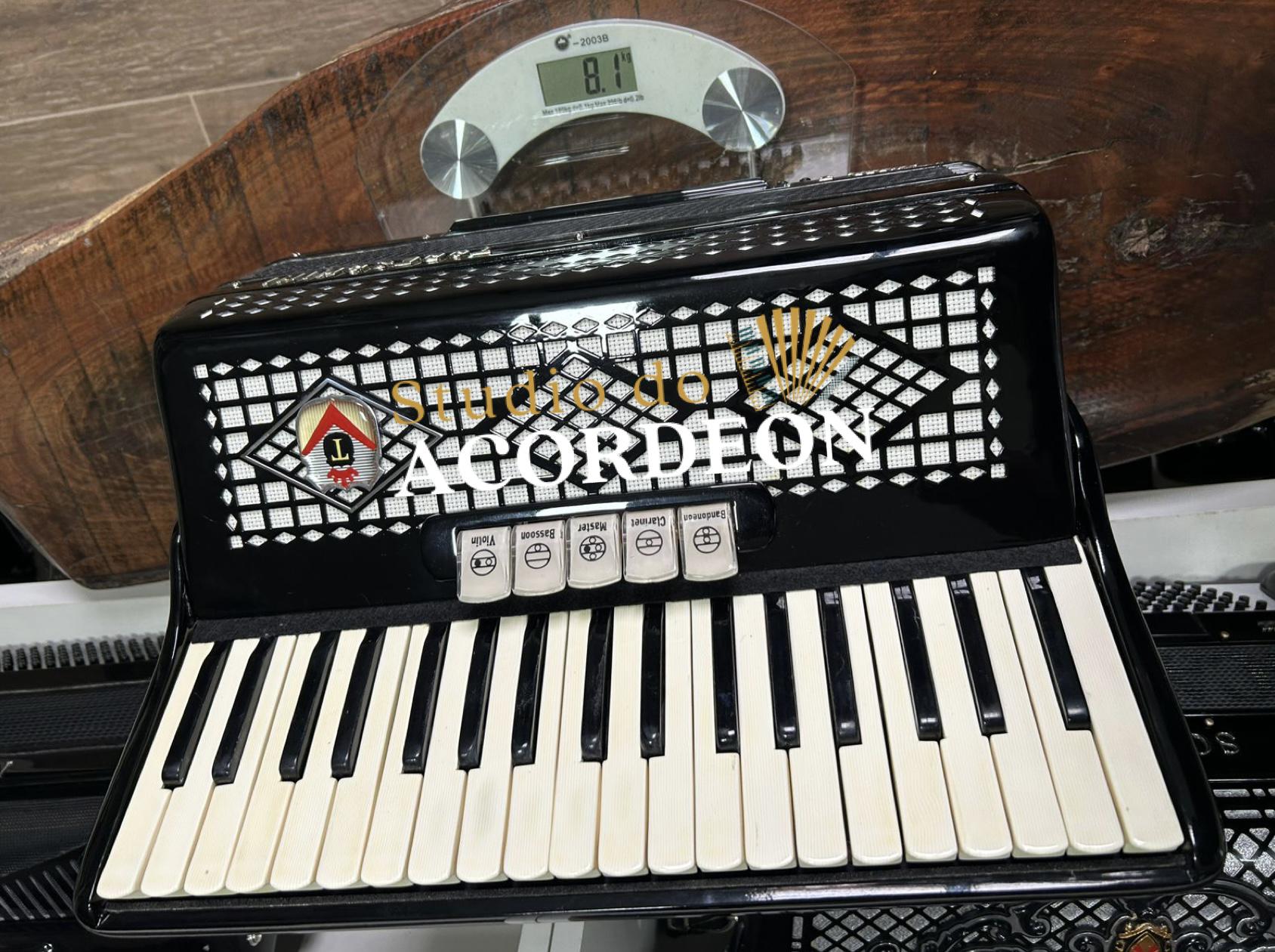 7/2 registros; 3/5 de voz; 80 baixos; Peso aproximado 8,100 kg; Selo verde e Astes redondas; Timbre forte; Alças e bag novos; Enviamos para todo Brasil; Parcelamento em até 12x com Acréscimo da operadora;