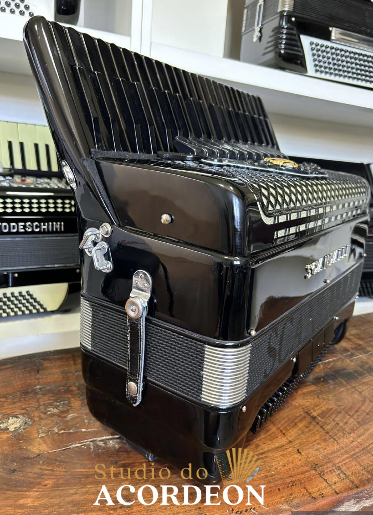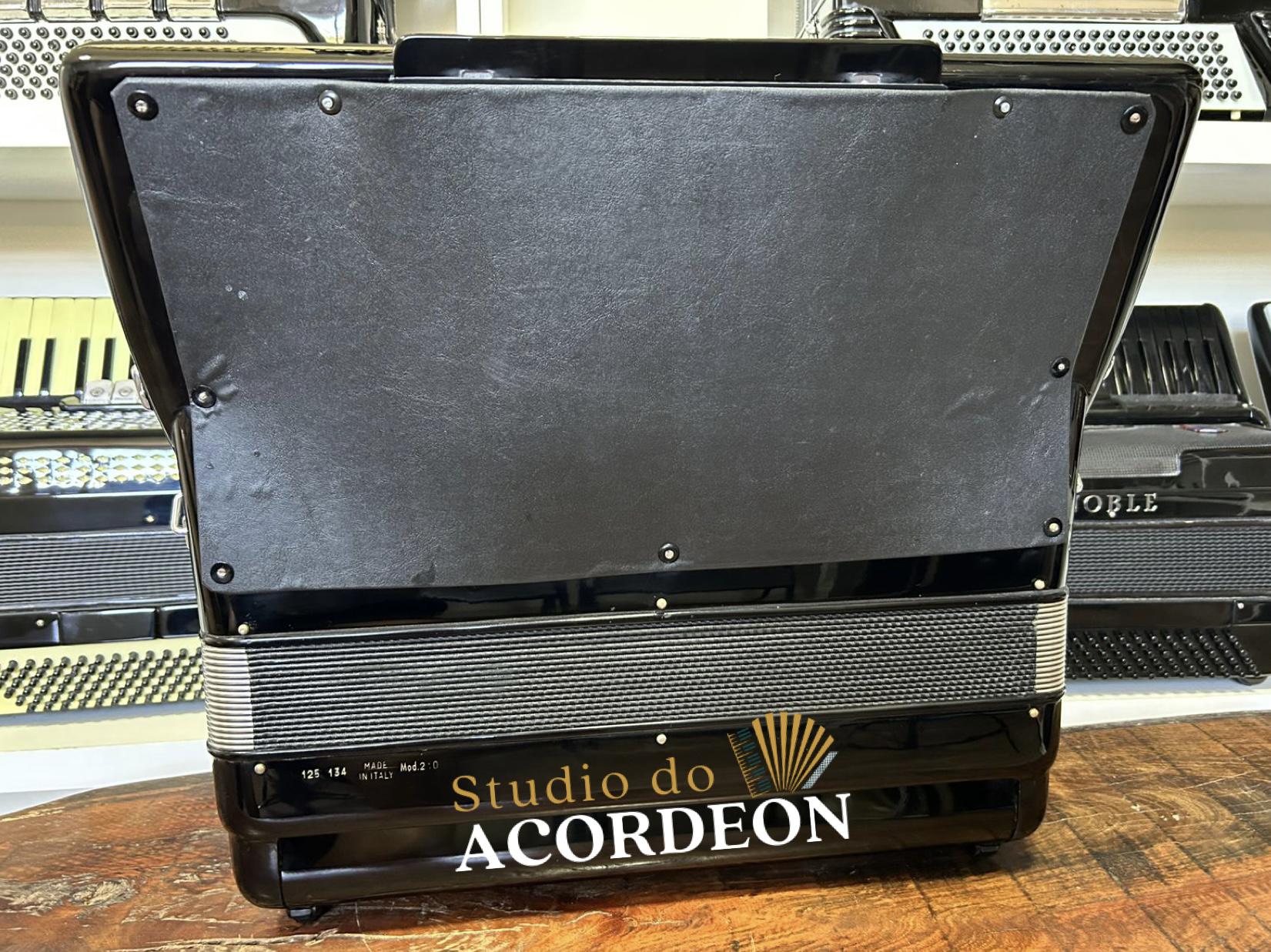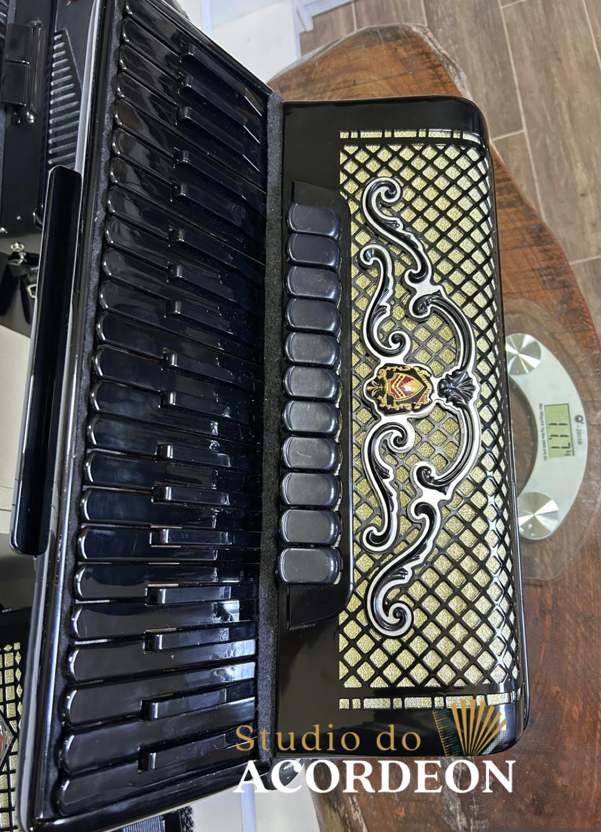 11/3 registros; Desarme Lateral; 3/4 de voz, com Violin original; Musicamento Binci; Teclado tamanho profissional com 49cm; 120 baixos; 11.700kg aproximado; Fole e afinação 💯%; Alças de ombro e bag novo; Estado de nova; Enviamos para todo Brasil; Parcelamento em até 12x com Acréscimo da operadora.