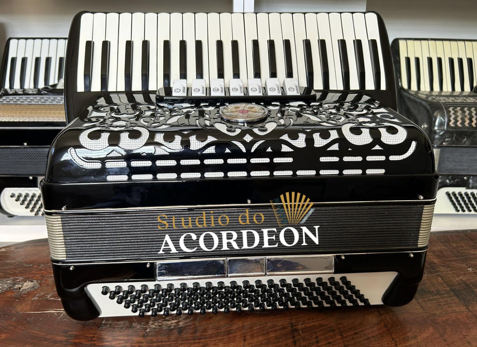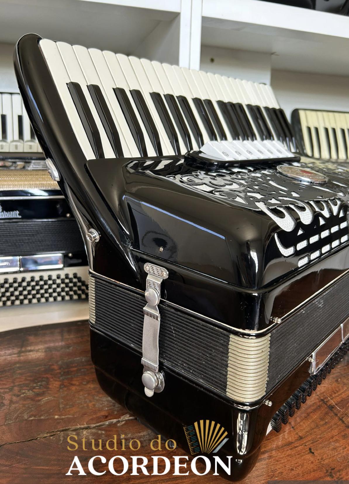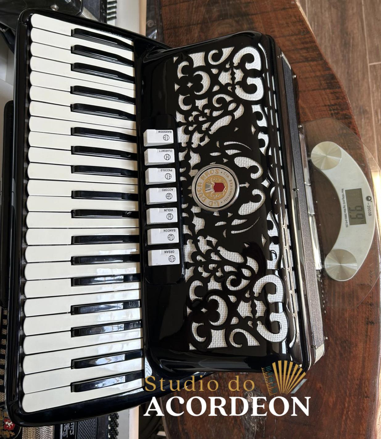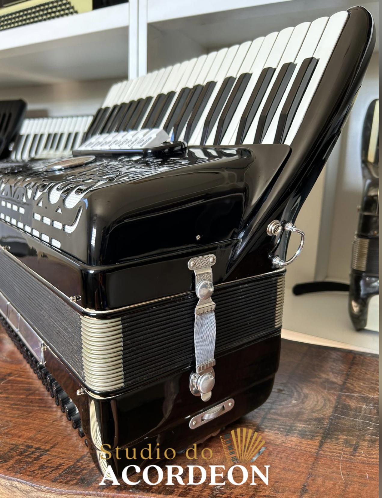 À venda Acordeon LO DUCA BROS🇮🇹 4/4/5de voz polifônica e oitavada de fábrica ; Desarme Lateral; Fabricação Italiana; Basson, Violin, Clarinete, piccolo, Accord, Bandon e Órgão; Teclado médio com 45cm; 7/3 Registros; 120 baixos; Lacrada, nunca furada com eletrificações; Pressão de fole e afinação 💯 %; Peso 9.900Kg; Correias novas e bag novo; Frete grátis para todo Brasil para pagamento à vista; Parcelamento em até 12x nos cartões de crédito 💳