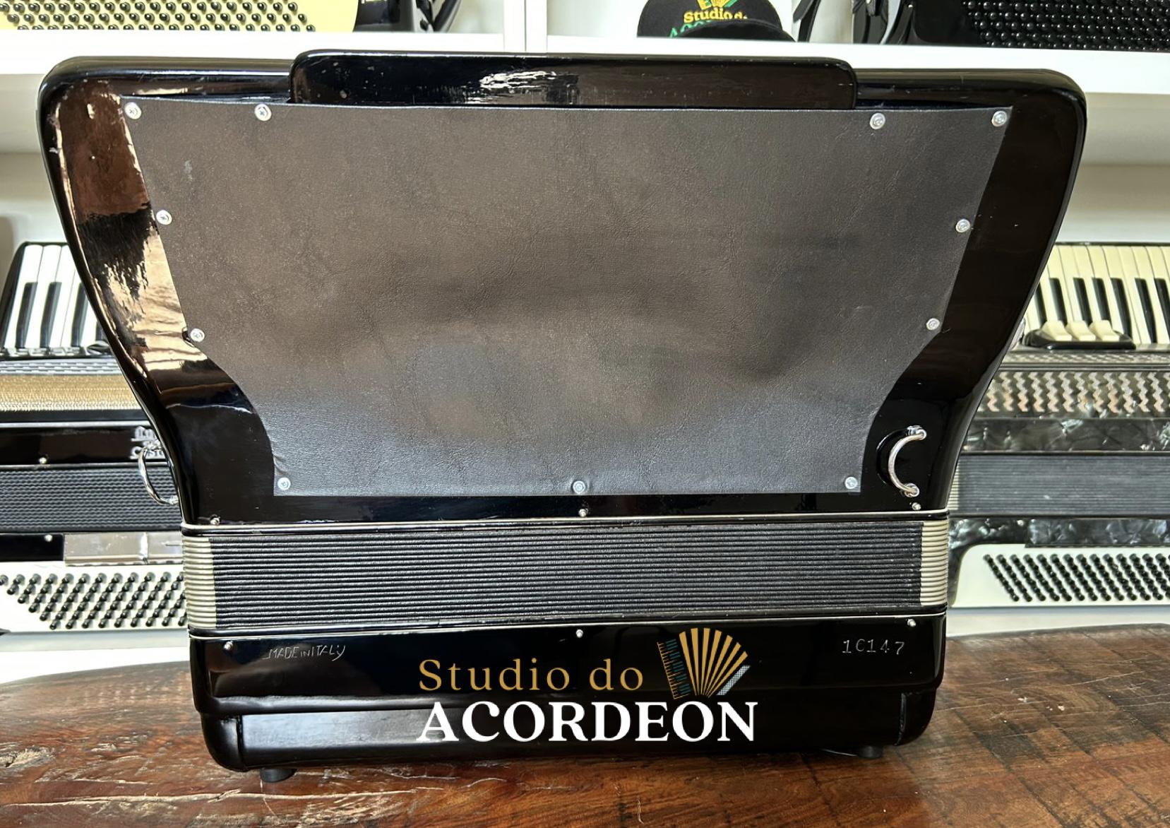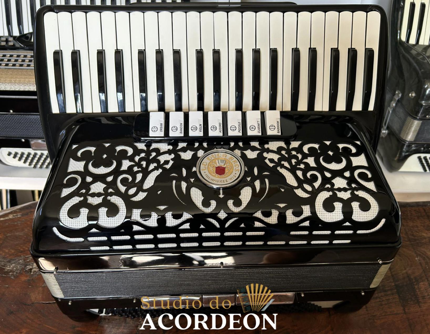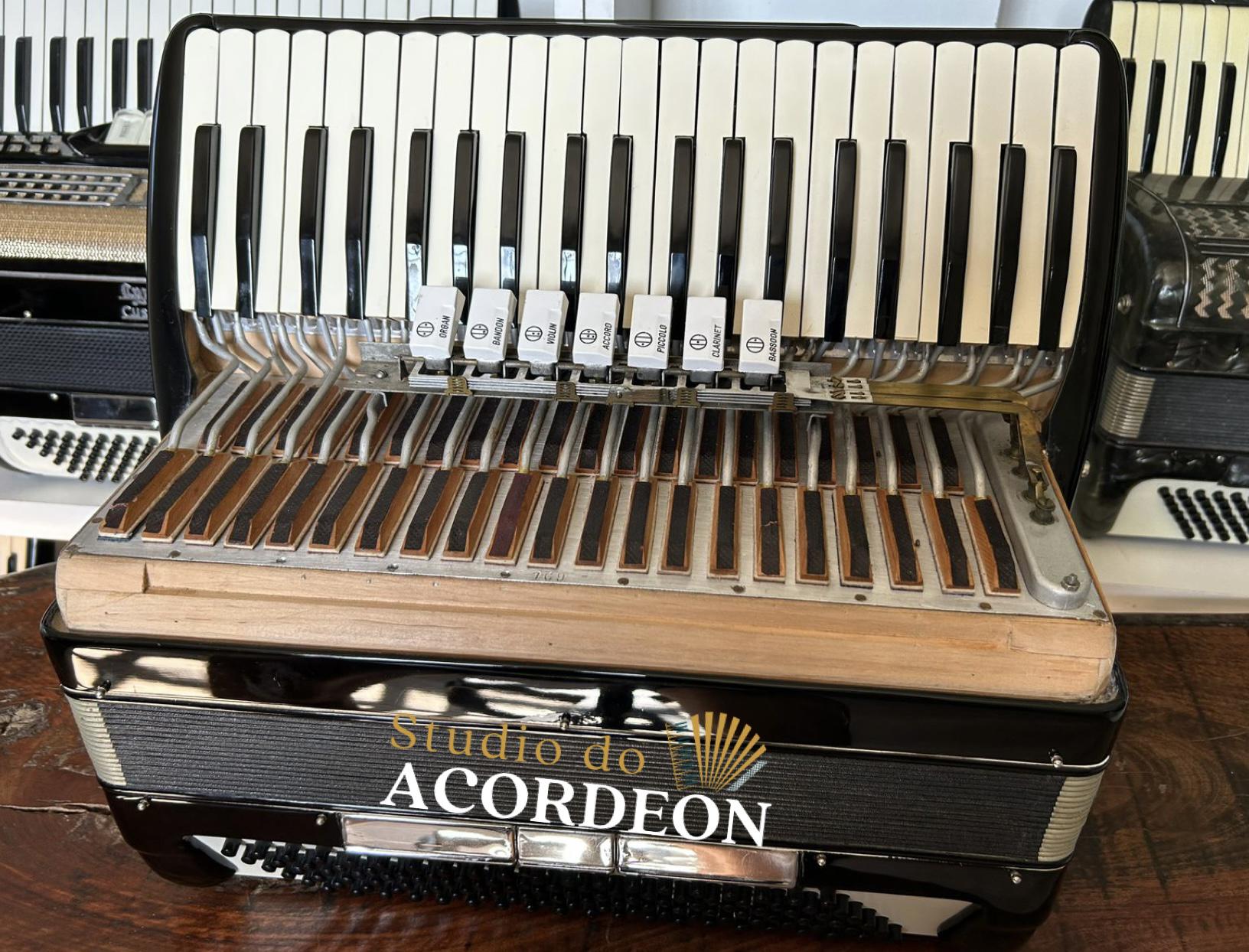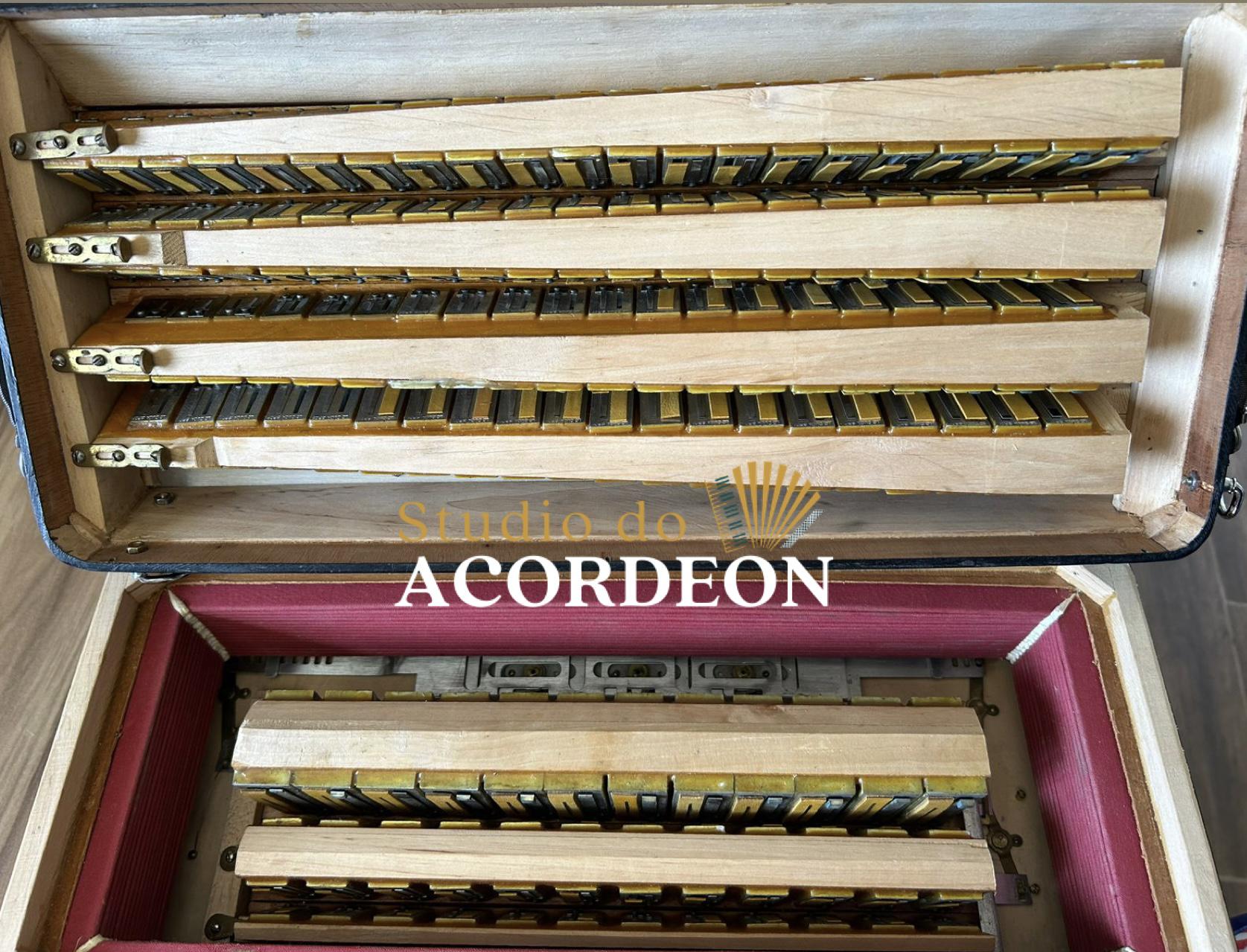 À venda Acordeon LO DUCA BROS🇮🇹 4/4/5de voz polifônica e oitavada de fábrica ; Desarme Lateral; Fabricação Italiana; Basson, Violin, Clarinete, piccolo, Accord, Bandon e Órgão; Teclado médio com 45cm; 7/3 Registros; 120 baixos; Lacrada, nunca furada com eletrificações; Pressão de fole e afinação 💯 %; Peso 9.900Kg; Correias novas e bag novo; Frete grátis para todo Brasil para pagamento à vista; Parcelamento em até 12x nos cartões de crédito 💳