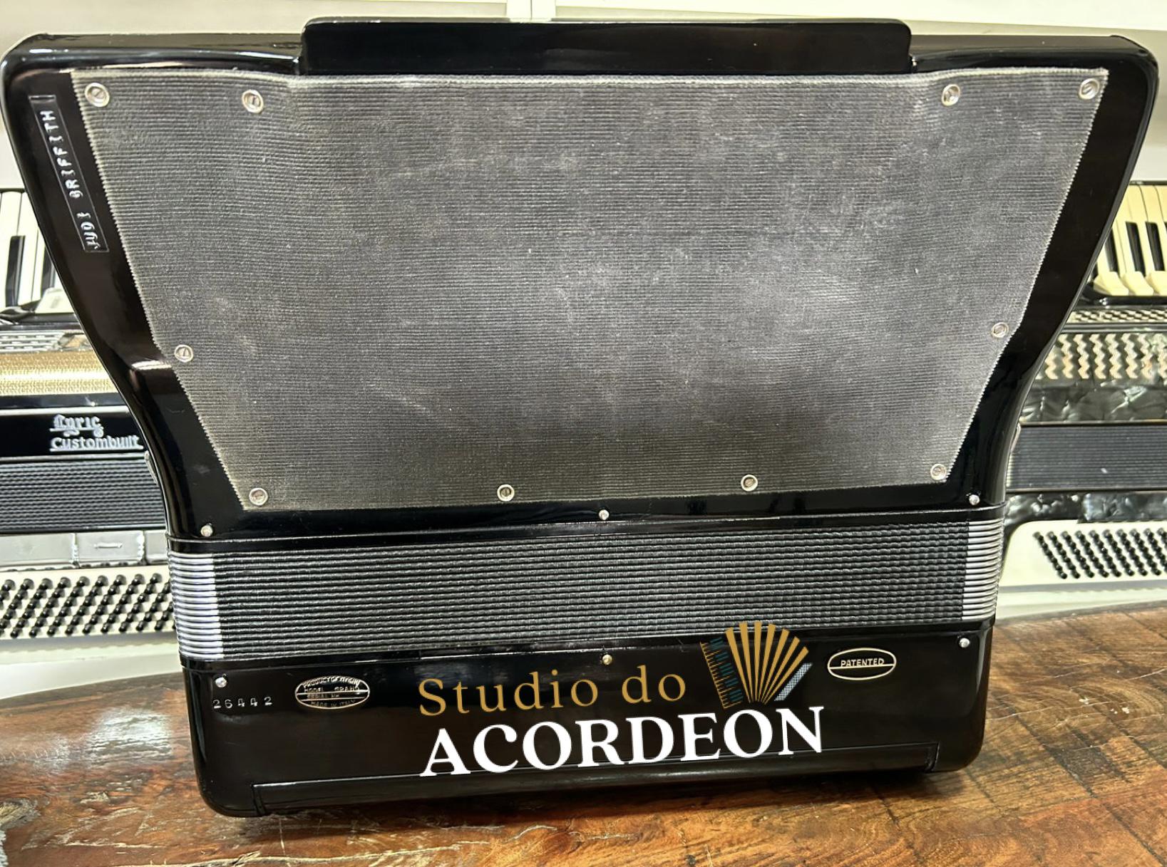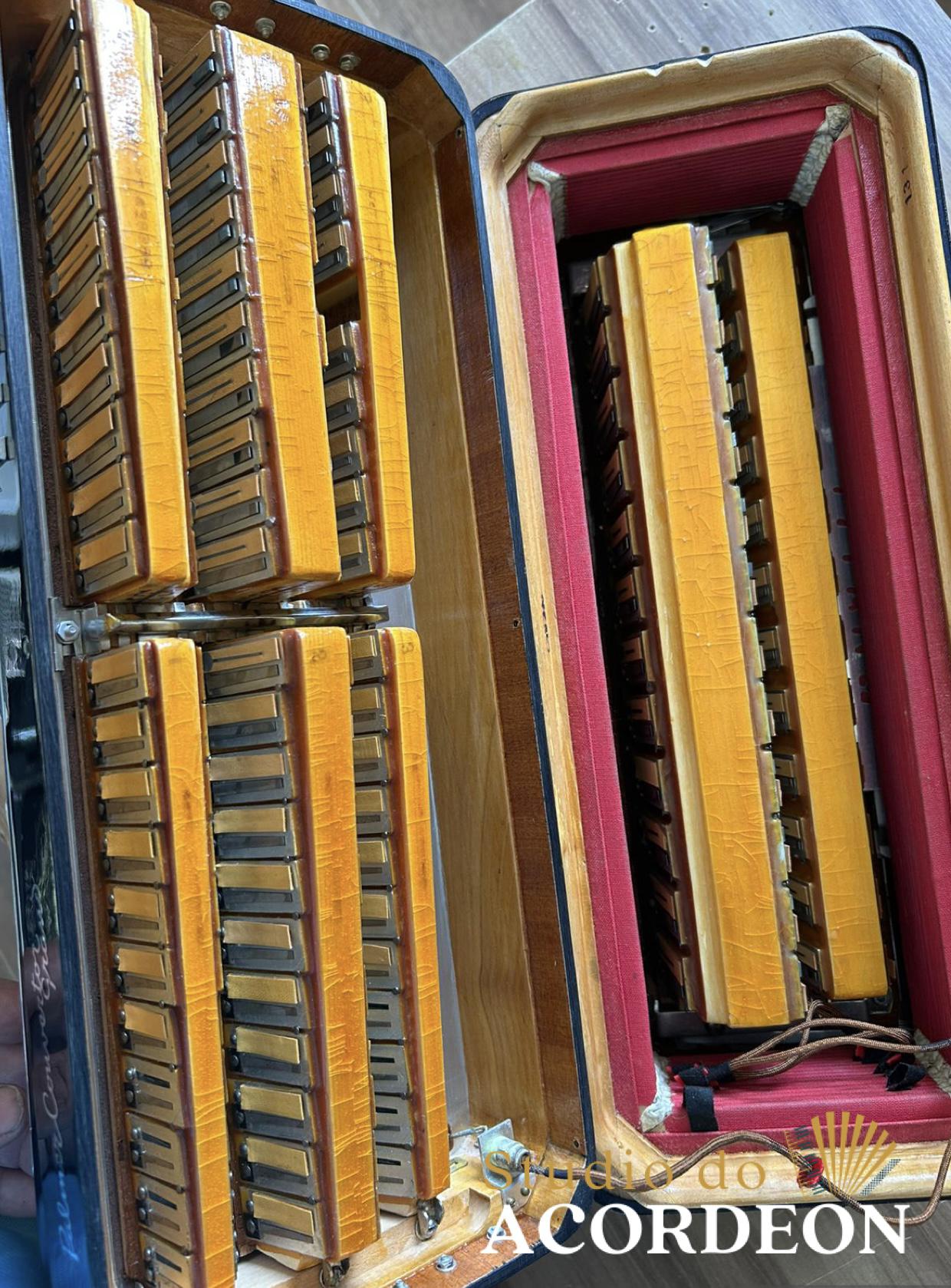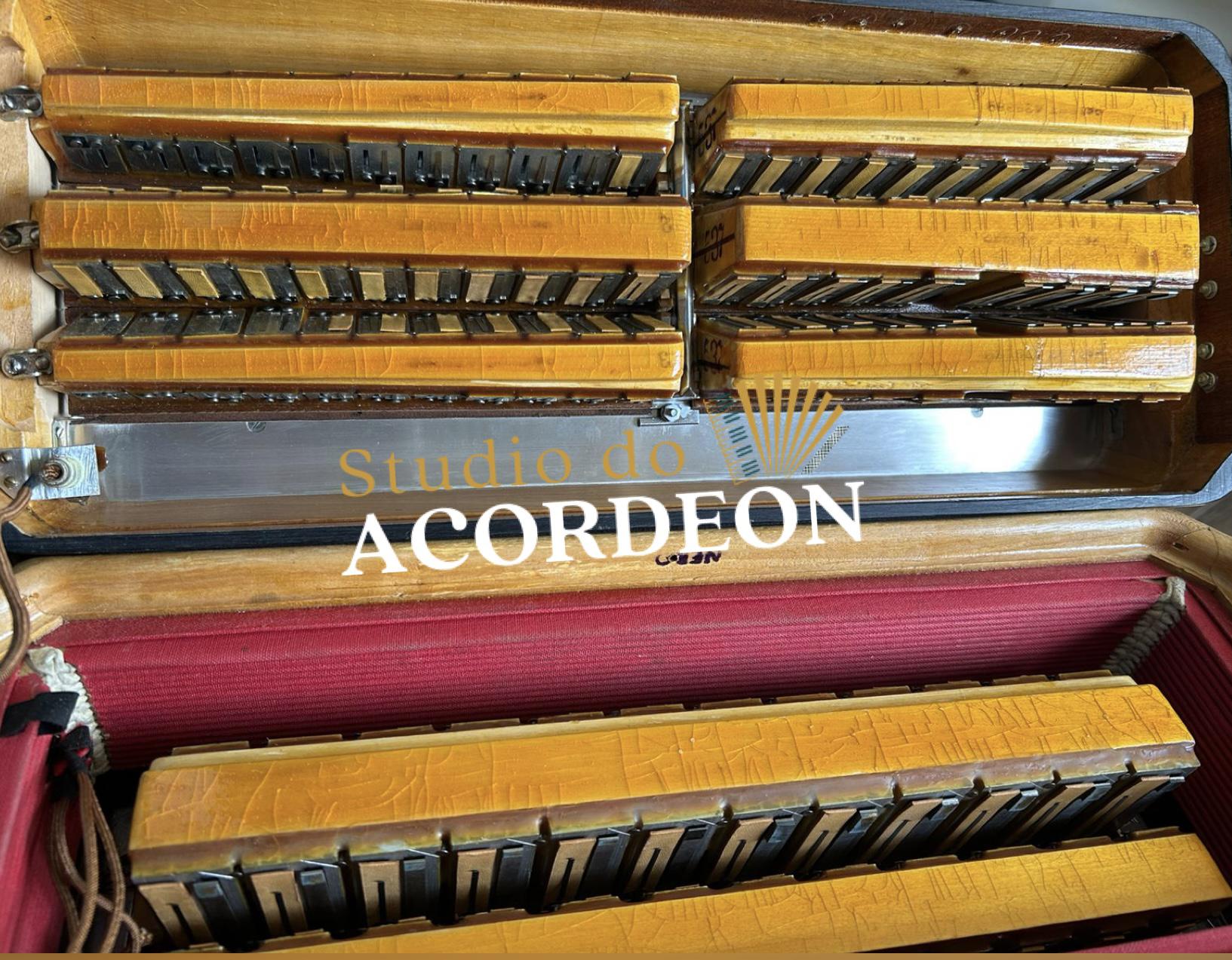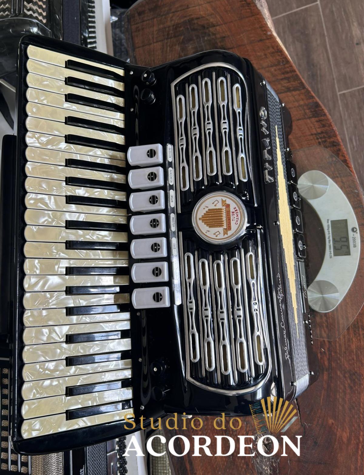 7/4 registros; Terça de voz oitavada de fábrica; Desarme Lateral; Teclado em madrepérola com 43cm; 120 baixos; 9.500kg aproximado; Timbre grave e aveludado; Fole e afinação 💯%; Alças e bag novo; Raro estado de conservação e originalidade; Enviamos para todo Brasil; Parcelamento em até 12x com Acréscimo da operadora;