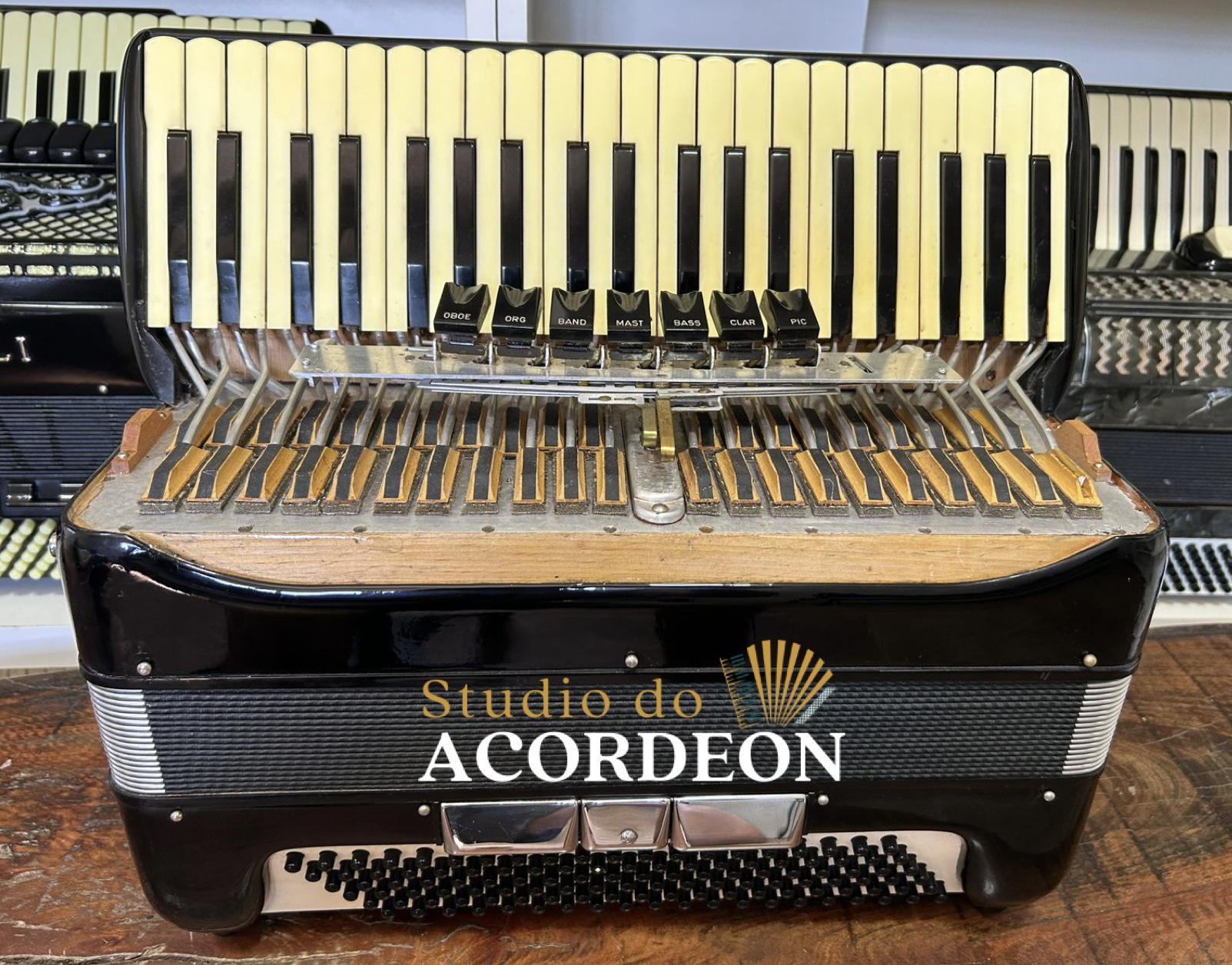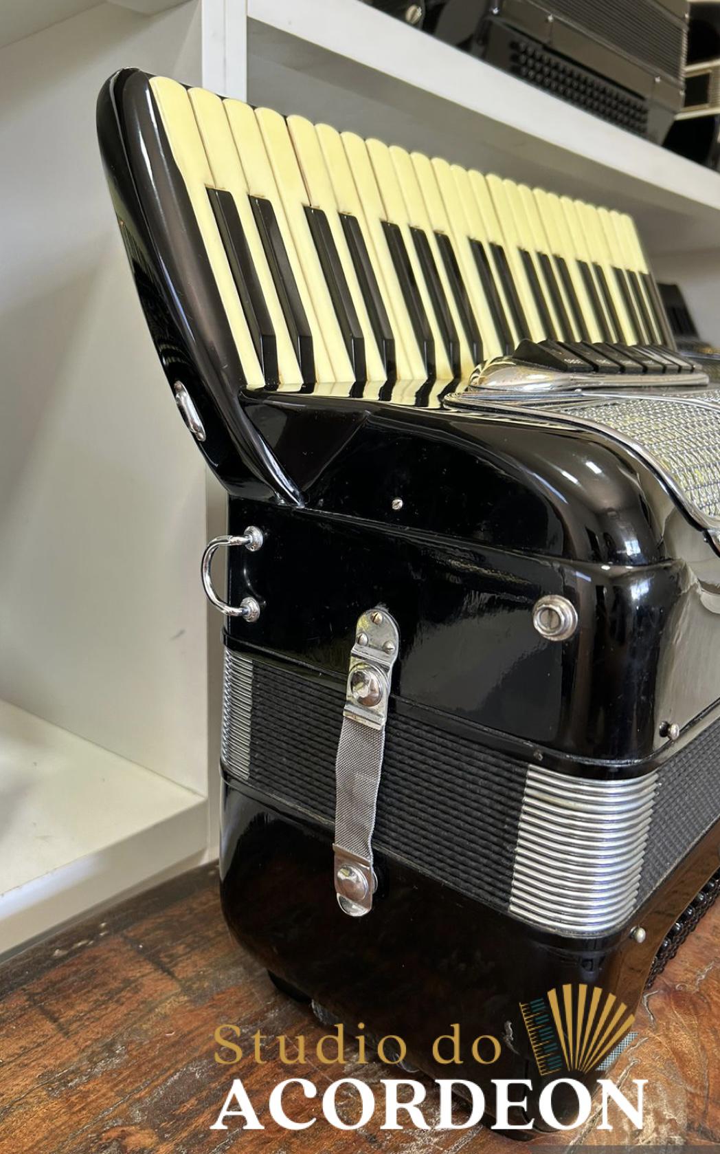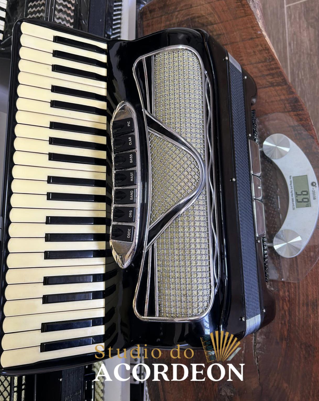 7/3 Registros; 3/5 de voz oitavada de fábrica; Nunca furada com eletrificações; Teclado com 46cm; 120 baixos; 9.900kg aproximado; Timbre bem harmônico característico das italianas; Fole e afinação 💯%; Alças e bag novo; Enviamos para todo Brasil; Parcelamento em até 12x com Acréscimo da operadora;