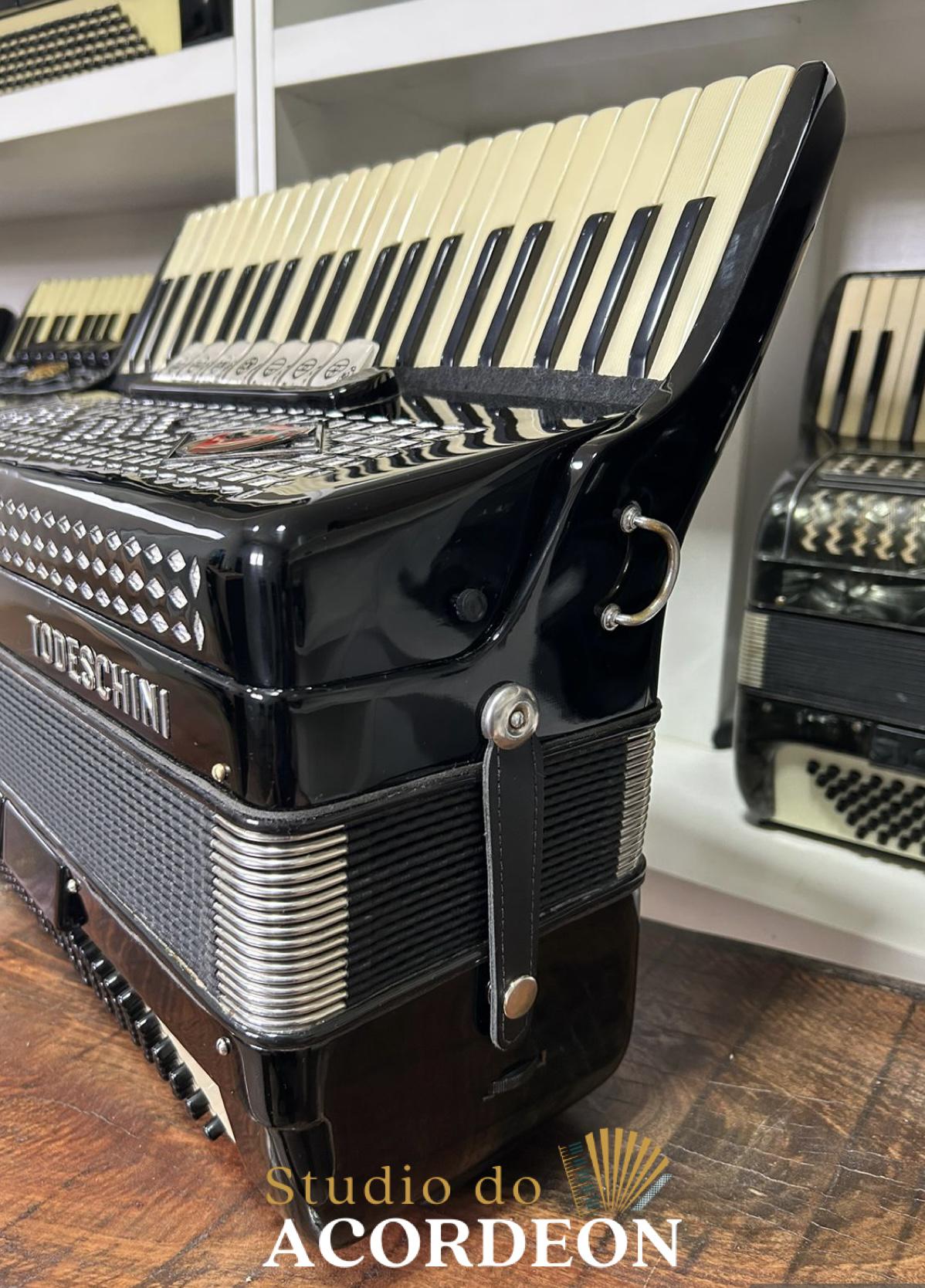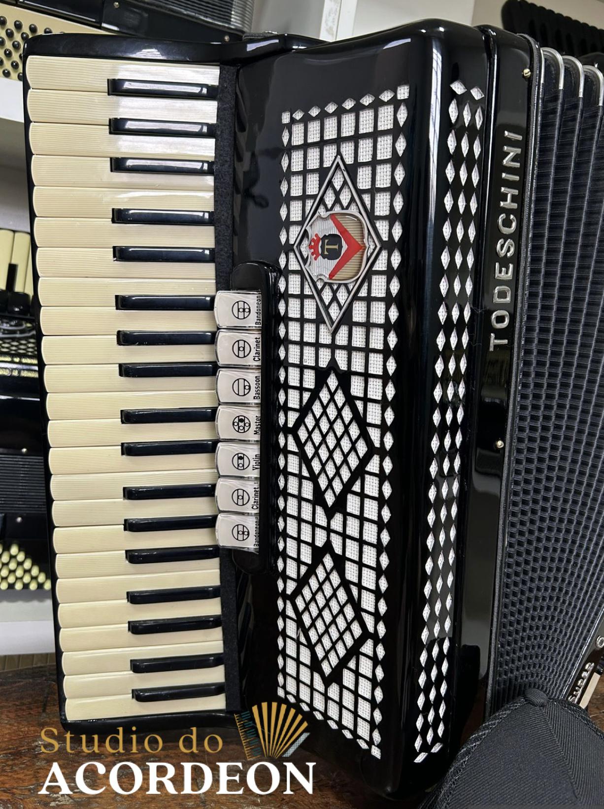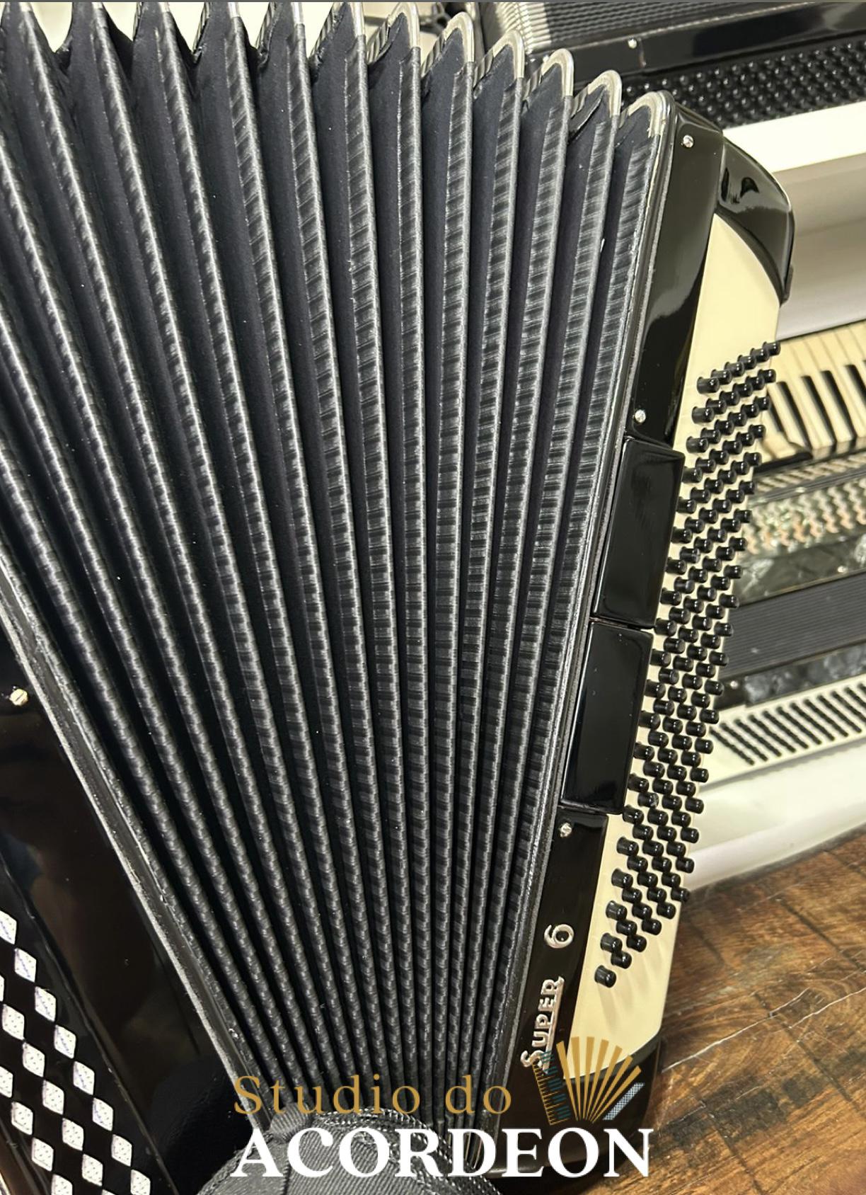 3/5 de voz; Afinação com Violin original, Musicamento afinado e limpo; Teclado 47cm; 7/2 registros; 120 baixos; Estética em estado de nova; Pressão de fole 💯 %; 9kg aproximadamente; Alças de ombro e bag novo; Enviamos para todo Brasil🇧🇷