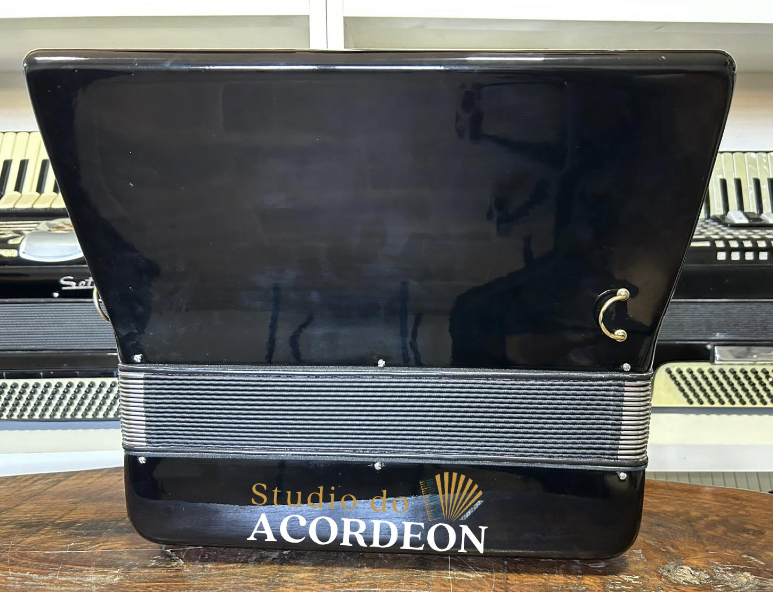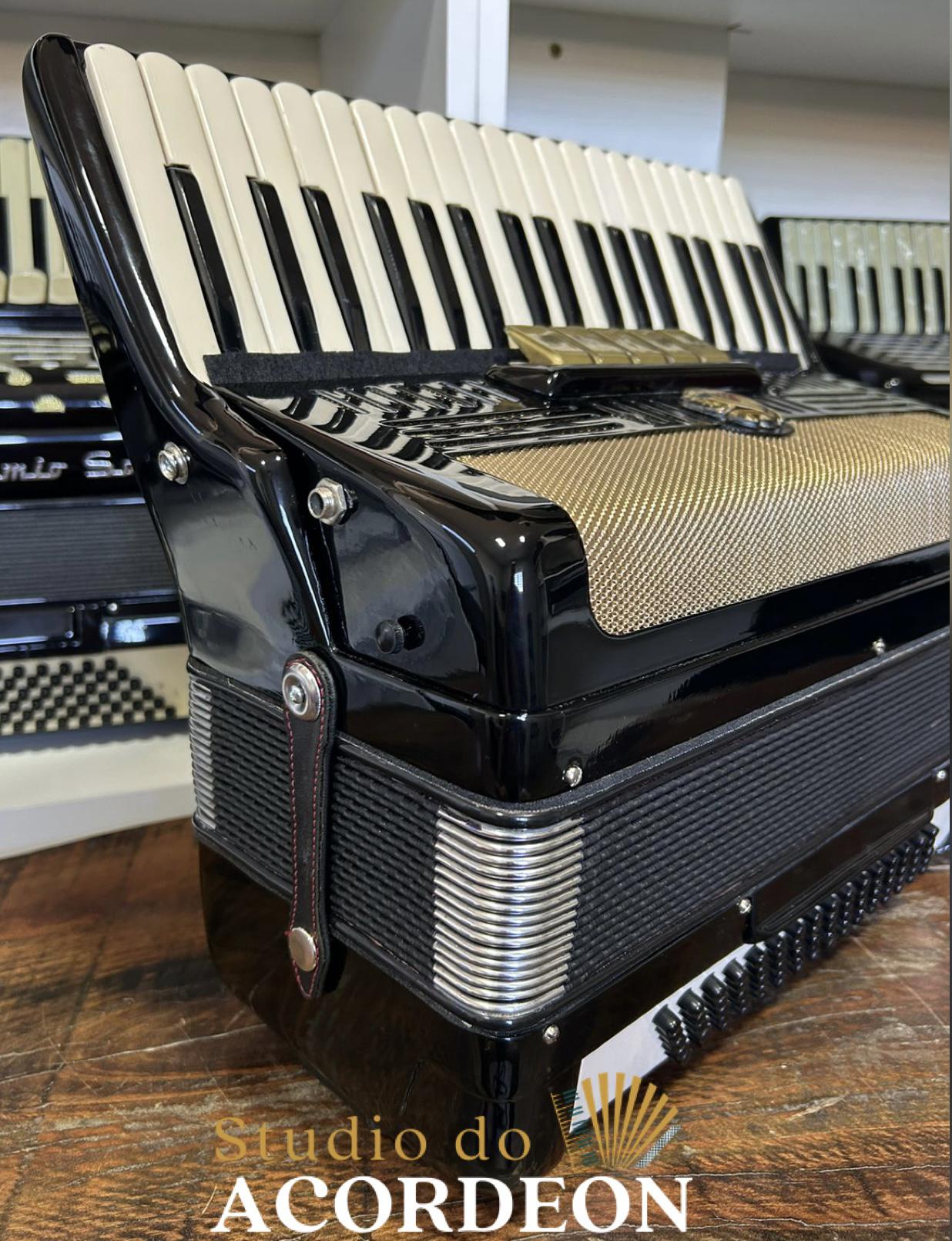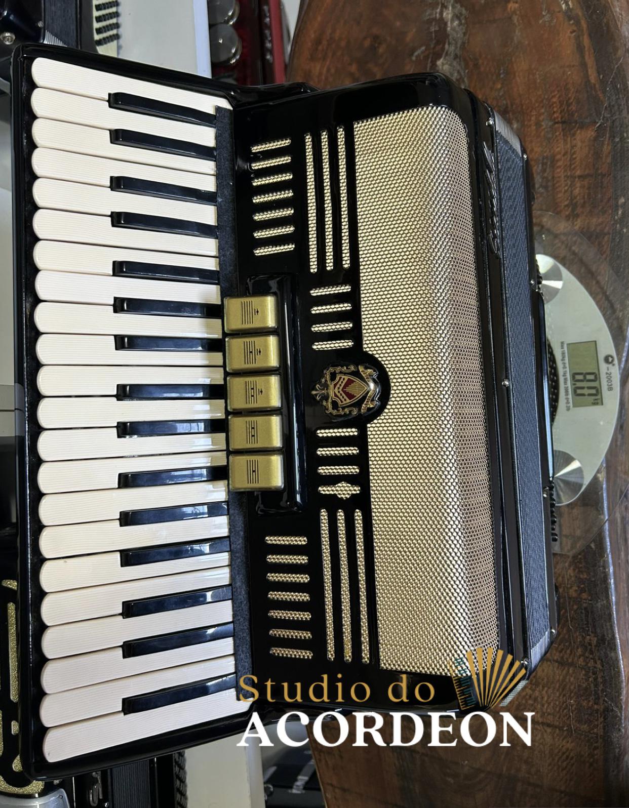3/5 de voz com violino; 80 Baixos; Modelo anos 50, série ouro; Fole e afinação 💯%; Teclado marfim original; Frete grátis para todo Brasil para pagamento à vista; Parcelamos em até 12X nos cartões 💳