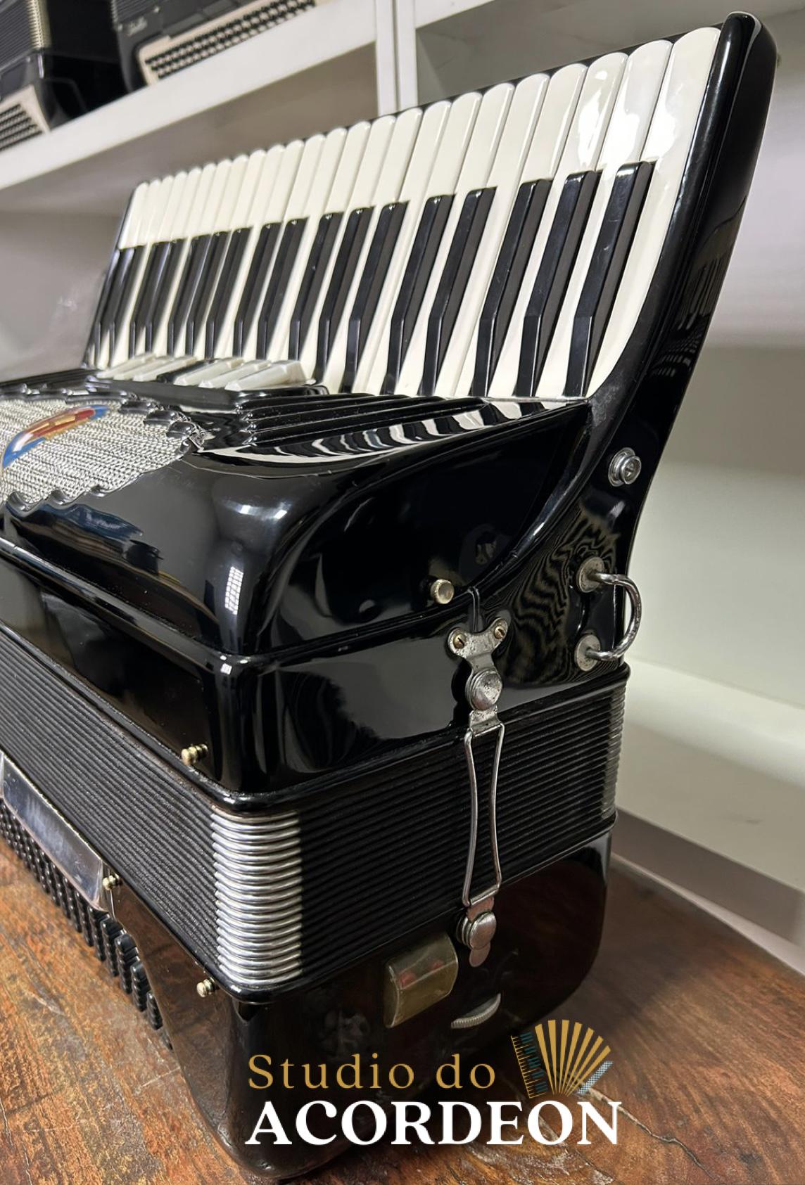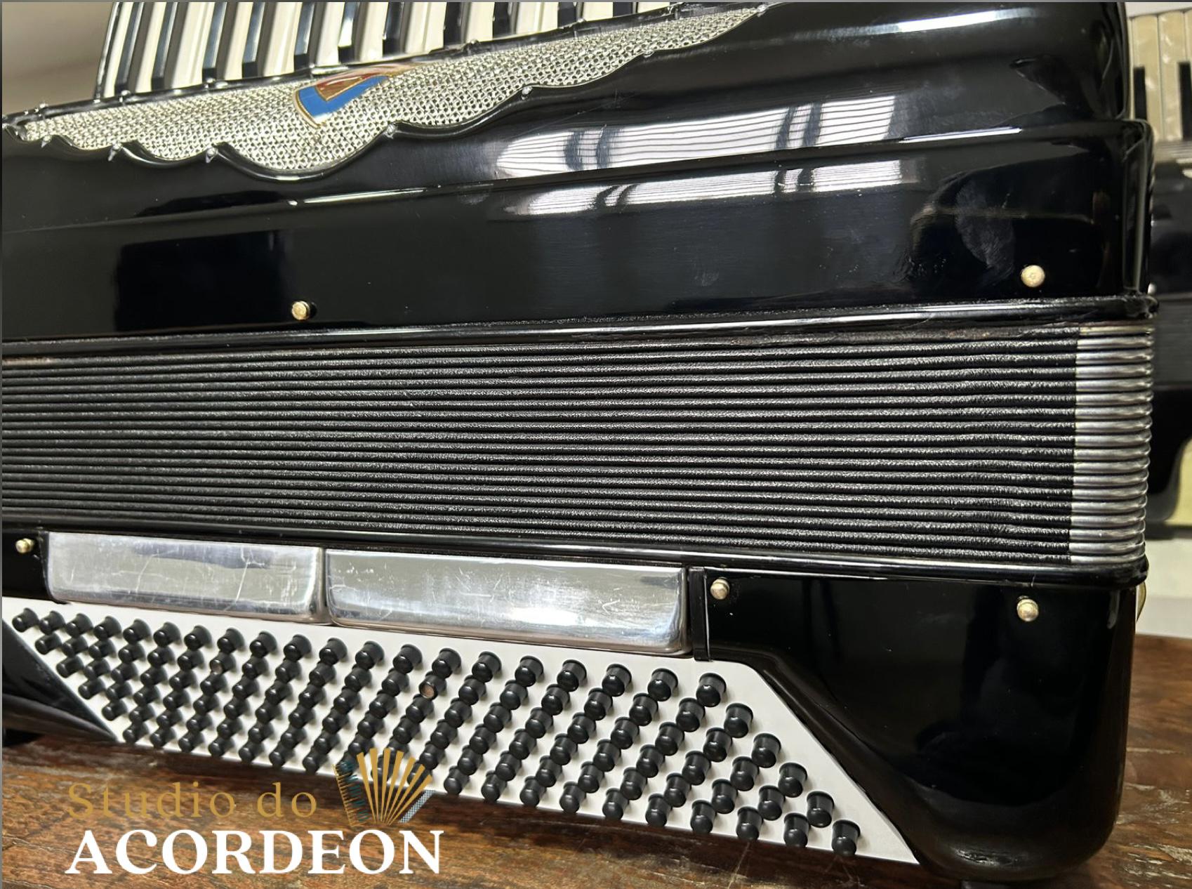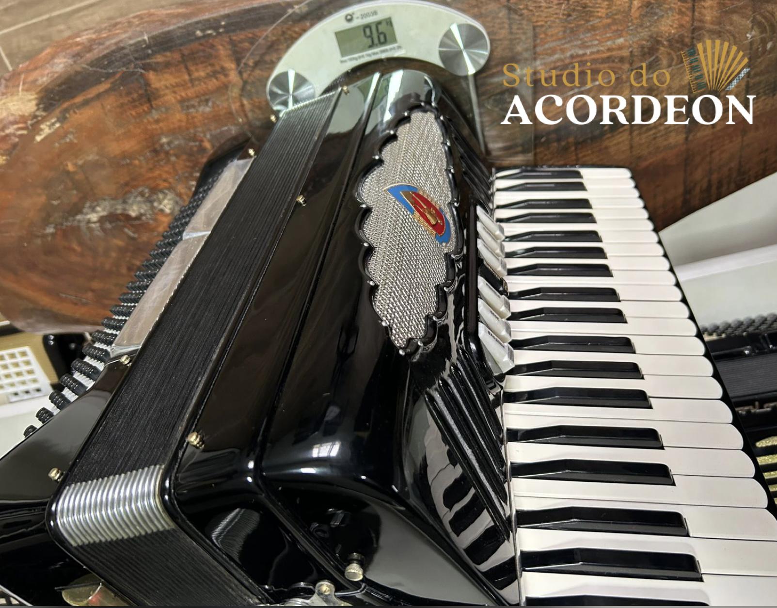 7/3 registros; 3/5 de voz oitavada de fábrica; 120 Baixos; Fabricação Italiana; Fole e afinação 💯%; Teclado tamanho profissional com 49cm; 9.600kg; Lacrada, Instrumento chama atenção por seu estado de conservação e originalidade; Frete grátis para todo Brasil para pagamento à vista; Parcelamos em até 12X nos cartões 💳
