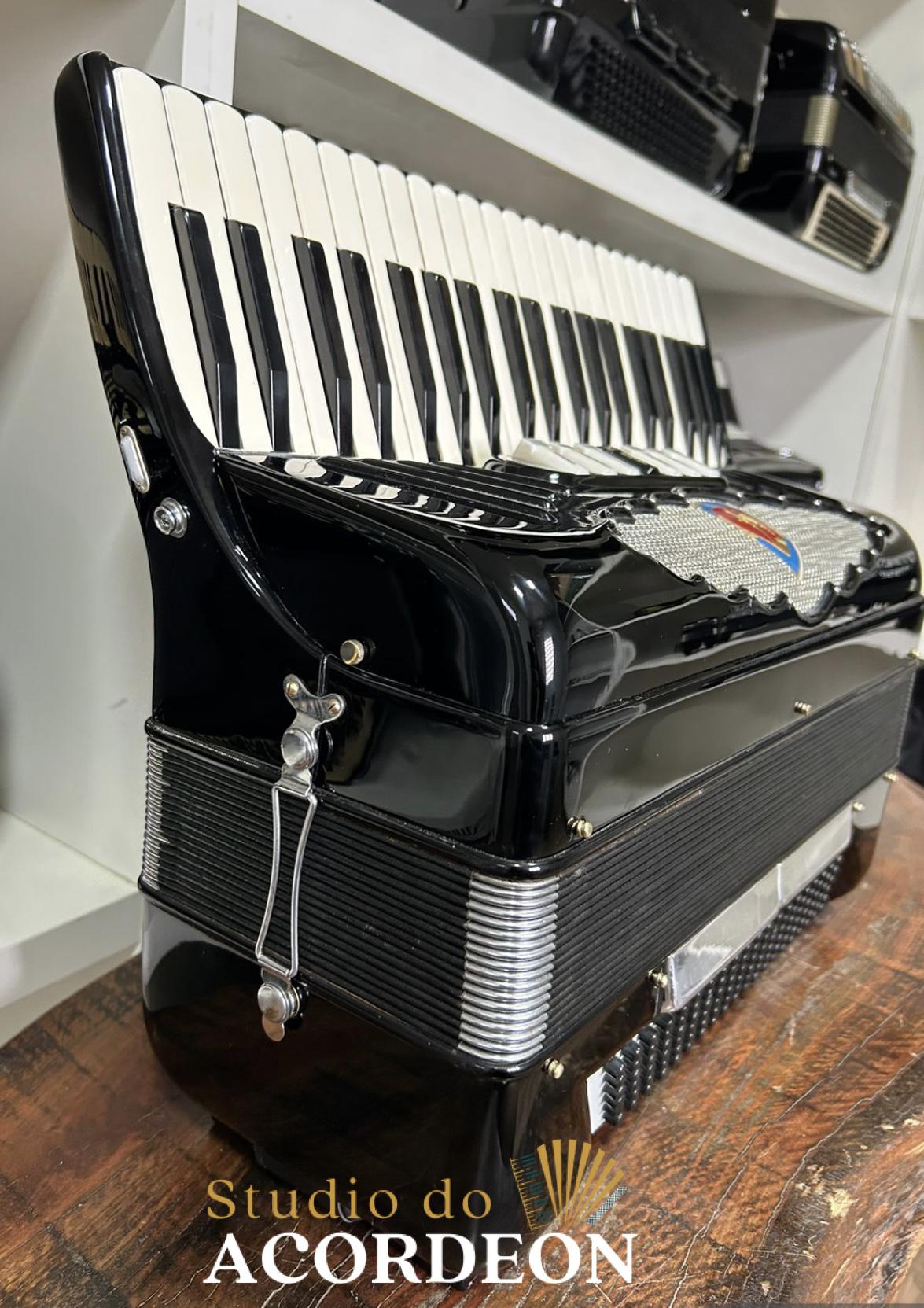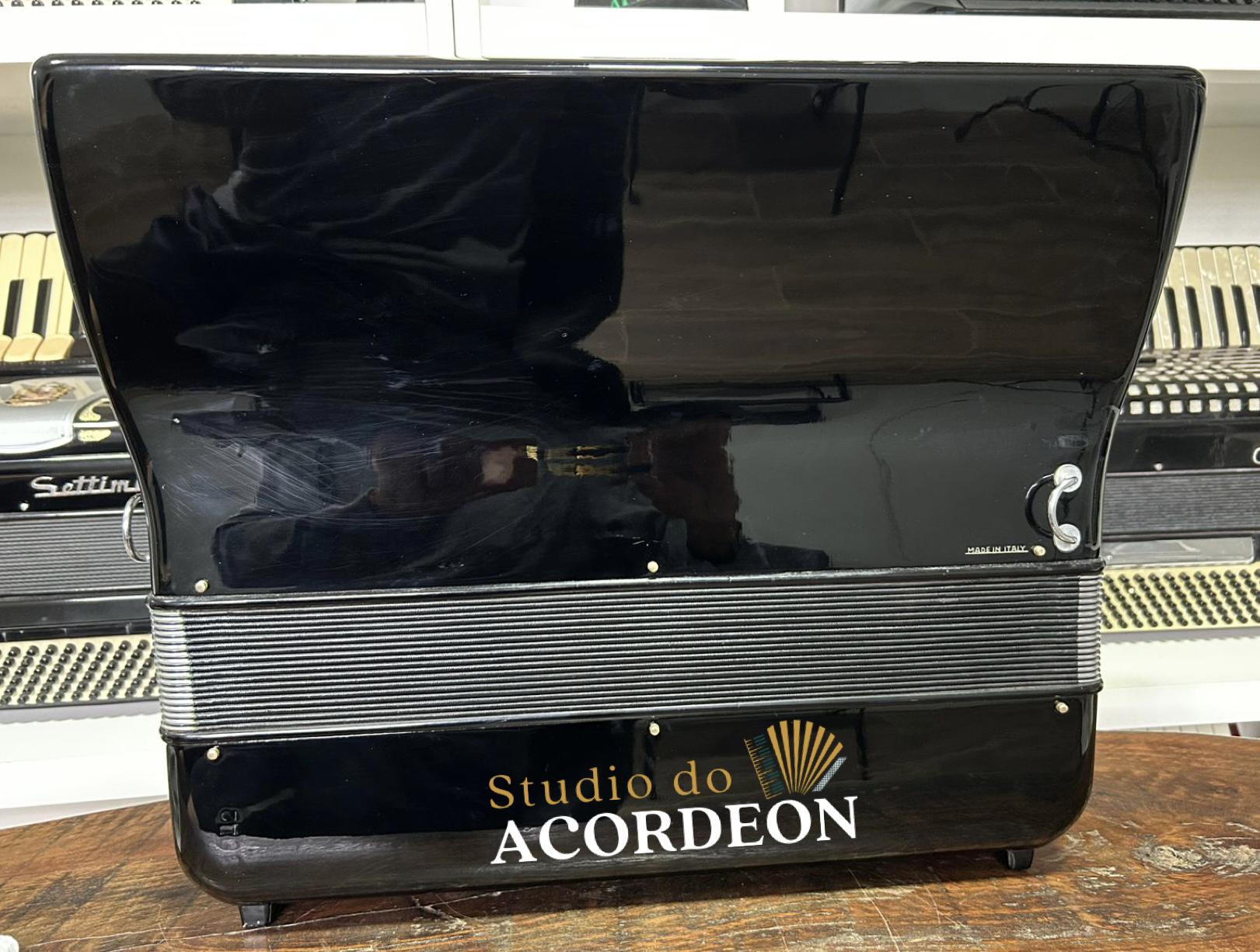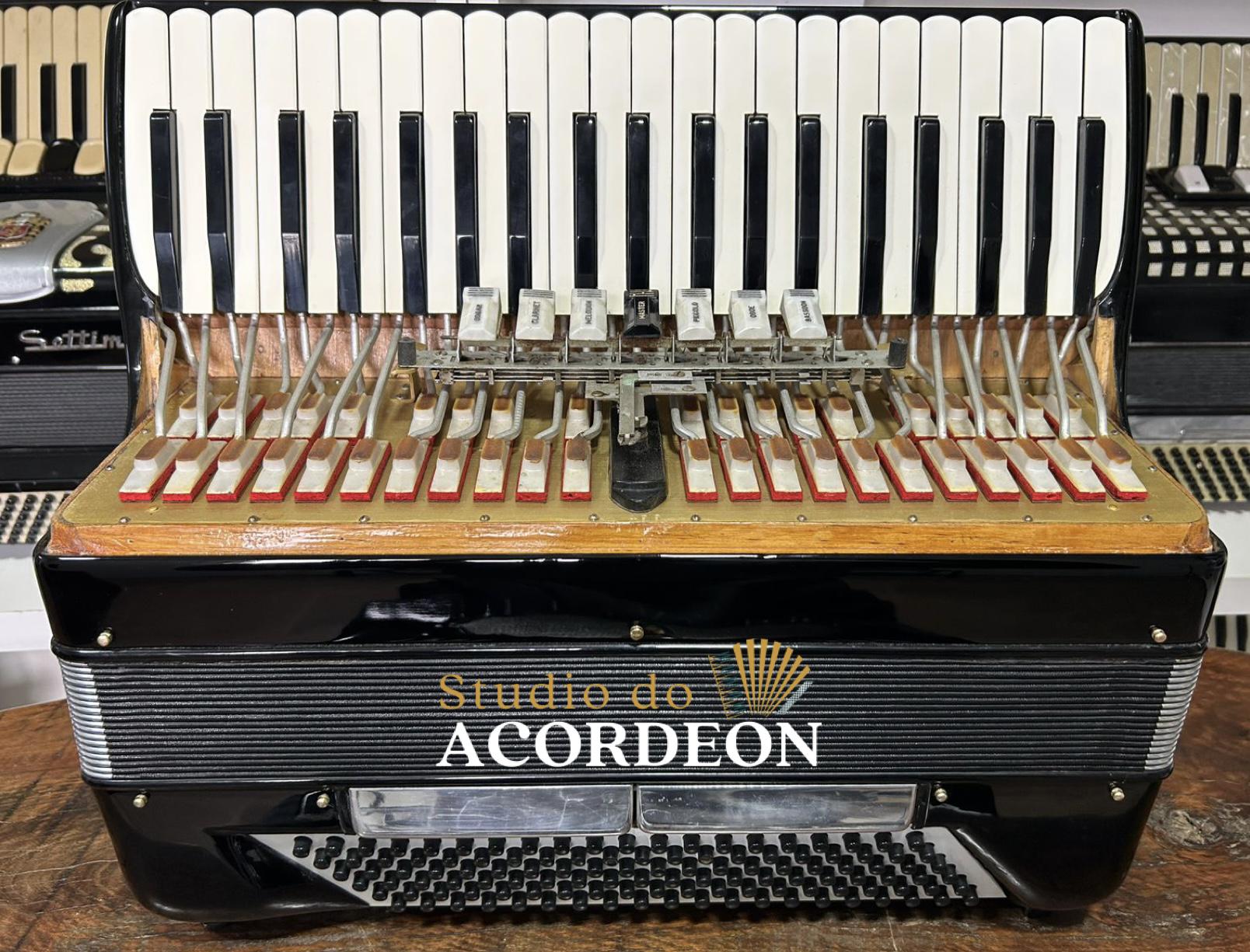 7/3 registros; 3/5 de voz oitavada de fábrica; 120 Baixos; Fabricação Italiana; Fole e afinação 💯%; Teclado tamanho profissional com 49cm; 9.600kg; Lacrada, Instrumento chama atenção por seu estado de conservação e originalidade; Frete grátis para todo Brasil para pagamento à vista; Parcelamos em até 12X nos cartões 💳