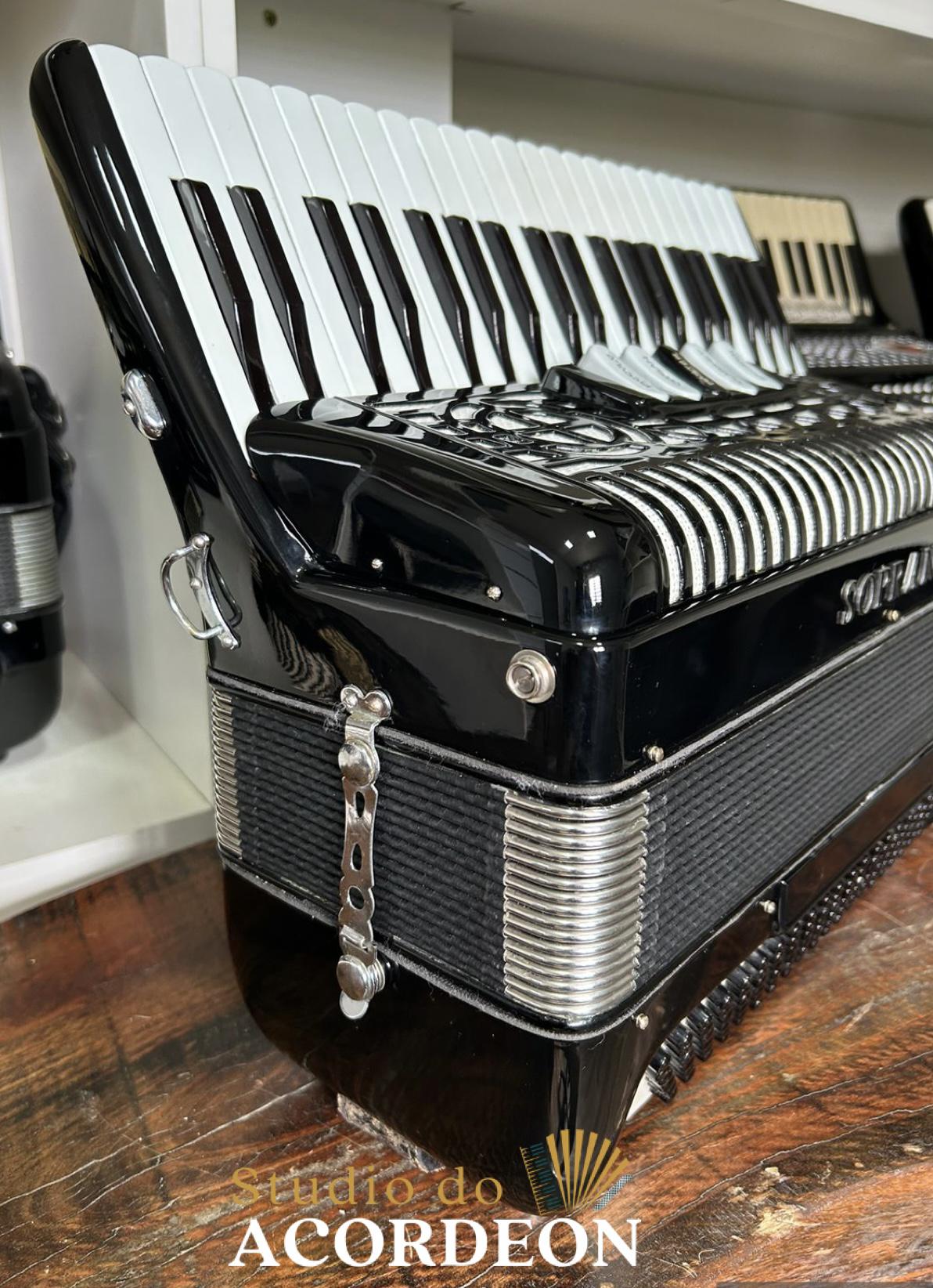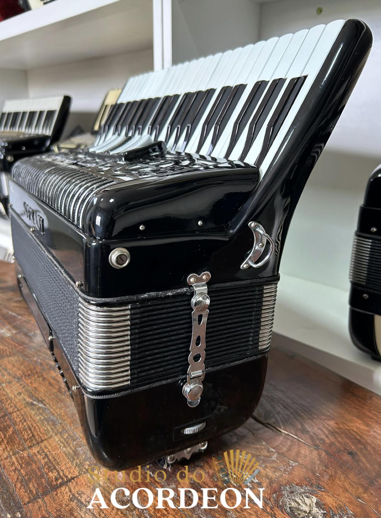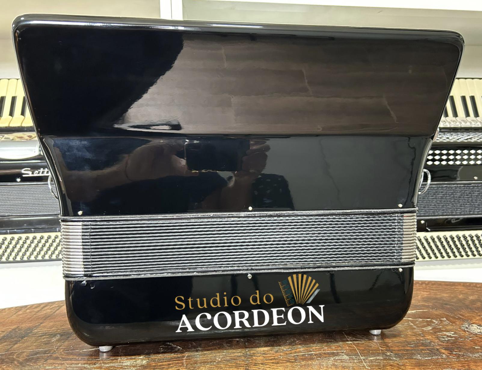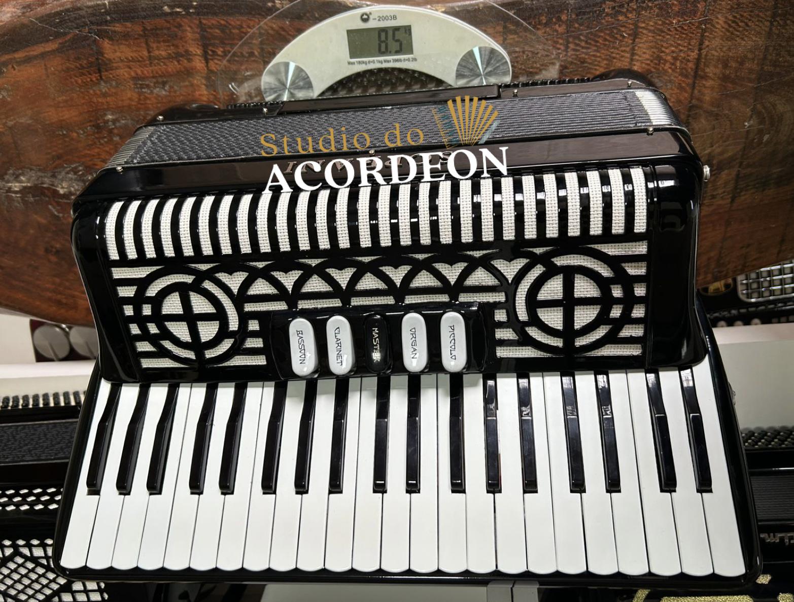 5/2 registros; 3/4 de voz Oitavada de fábrica; Fabricação Italiana; 120 Baixos; Celulóide Impecável, Fole e afinação 💯%; Teclado com 44cm; Apenas 8.500kg; Timbre aveludado; Frete grátis para todo Brasil para pagamento à vista; Parcelamos em até 12X nos cartões 💳