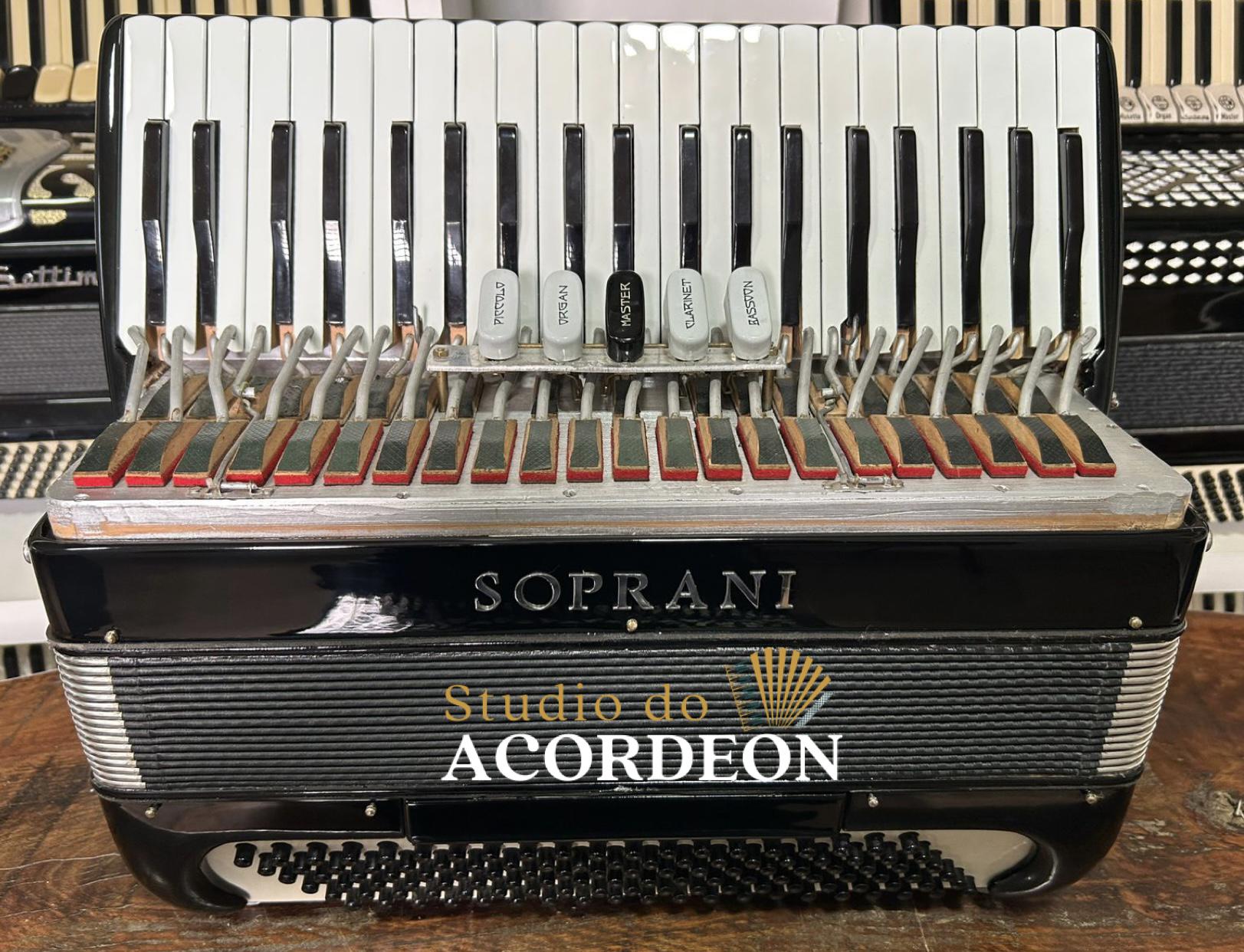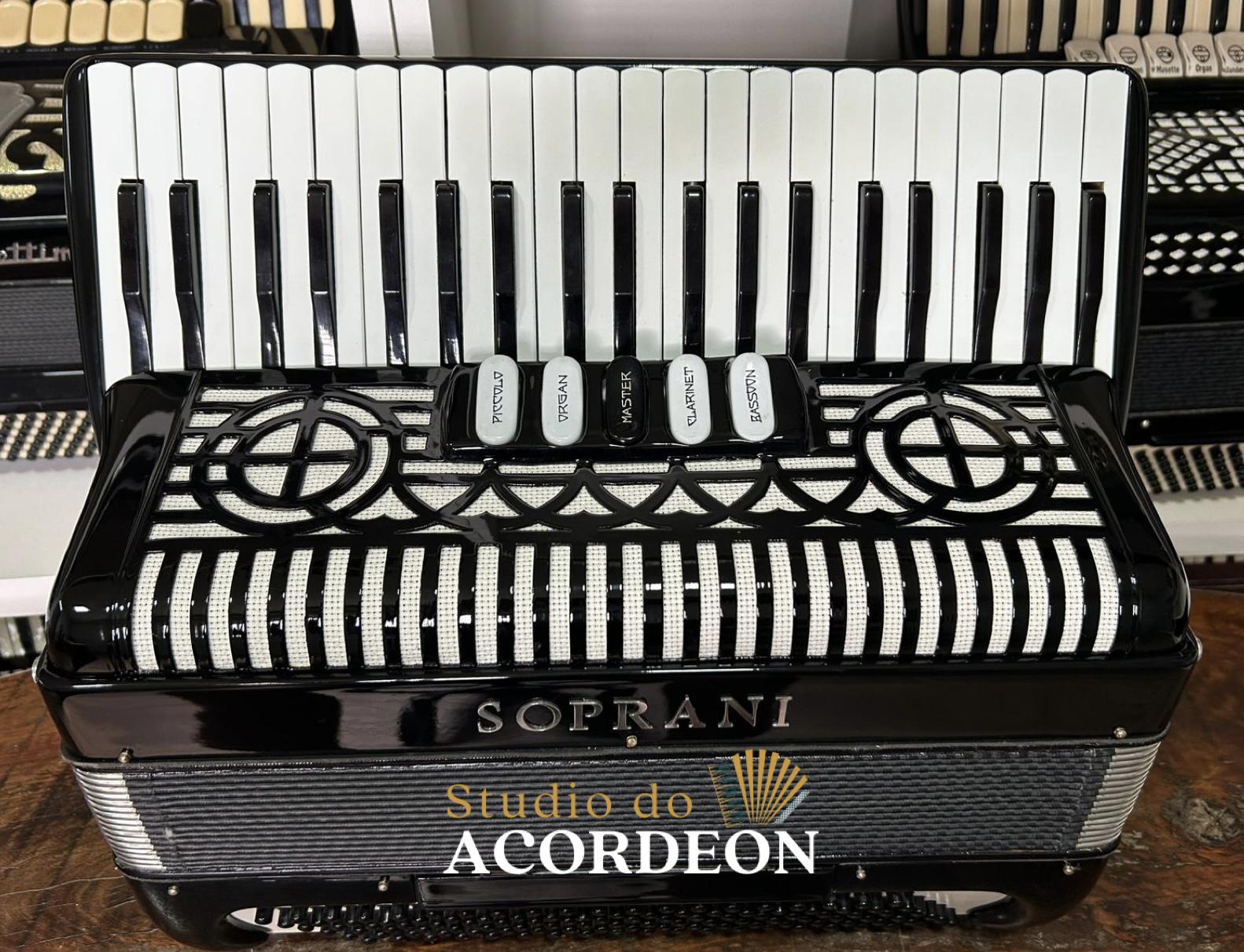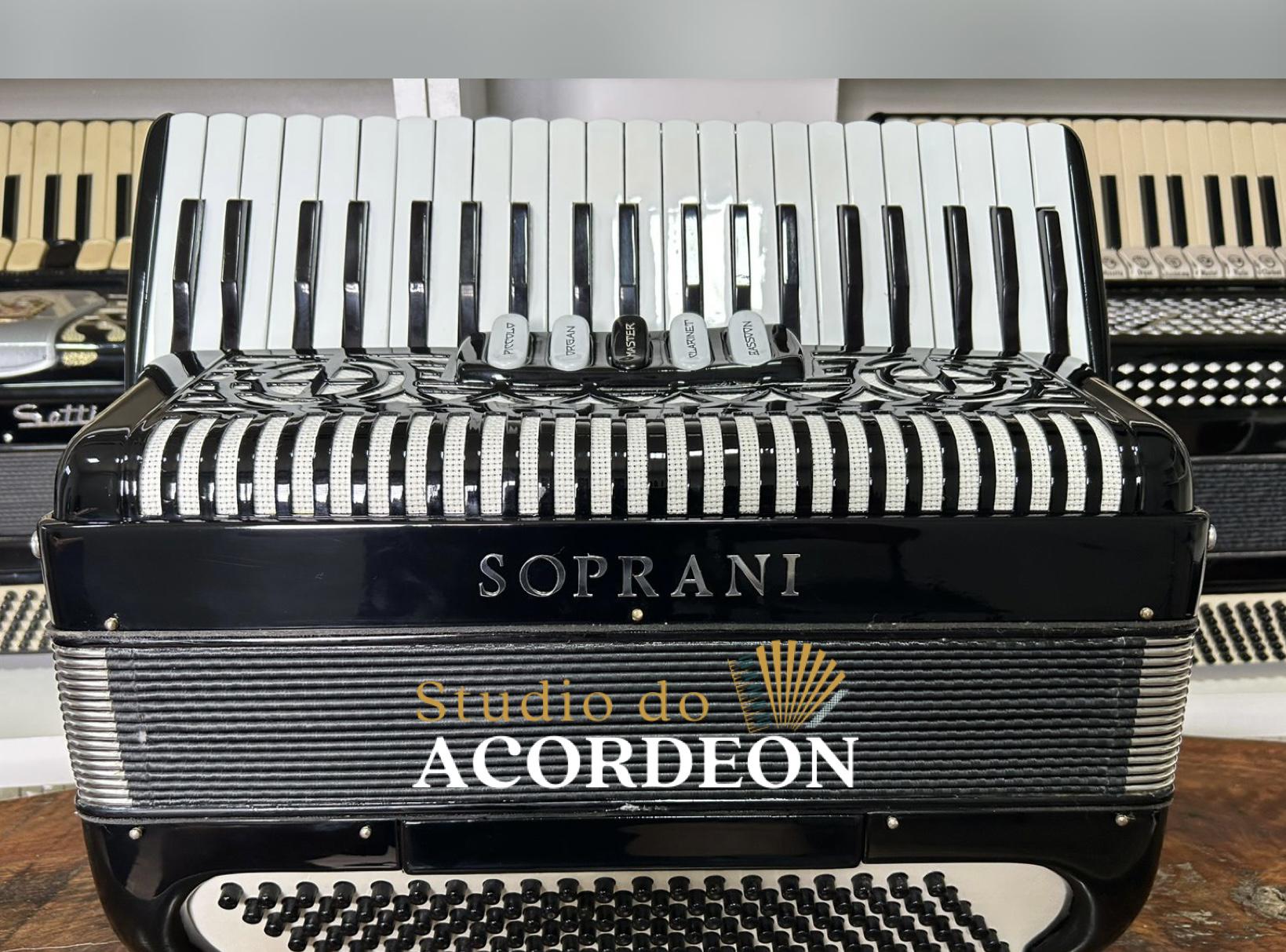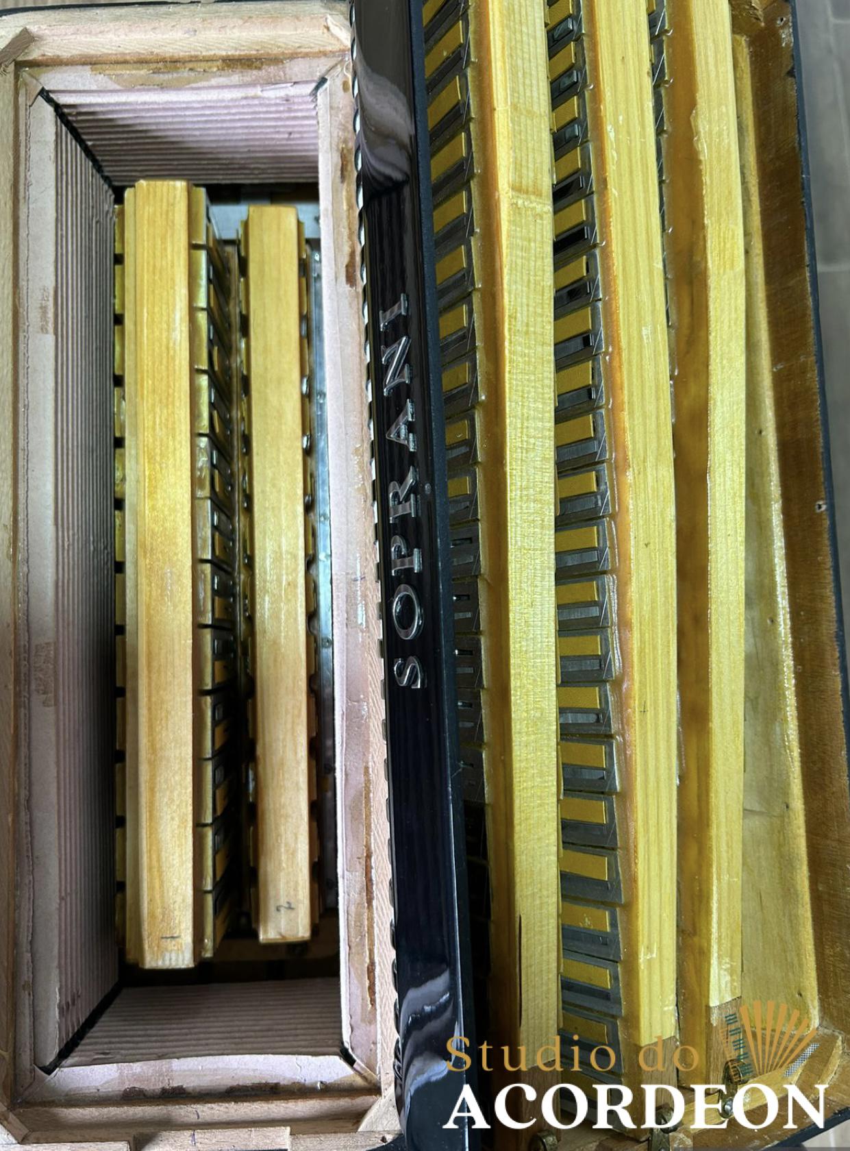 5/2 registros; 3/4 de voz Oitavada de fábrica; Fabricação Italiana; 120 Baixos; Celulóide Impecável, Fole e afinação 💯%; Teclado com 44cm; Apenas 8.500kg; Timbre aveludado; Frete grátis para todo Brasil para pagamento à vista; Parcelamos em até 12X nos cartões 💳