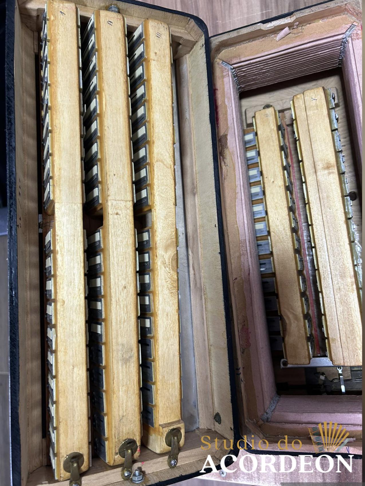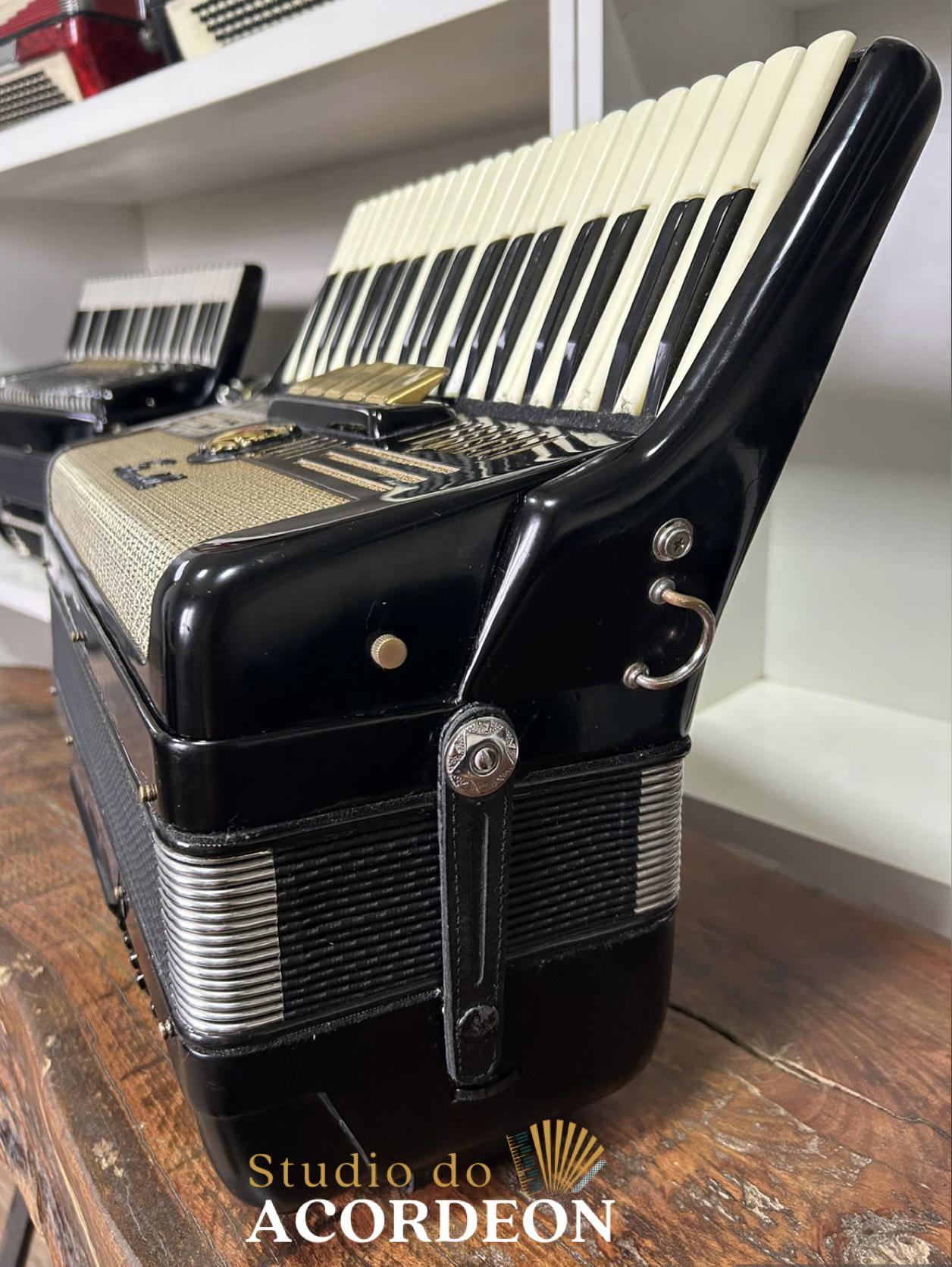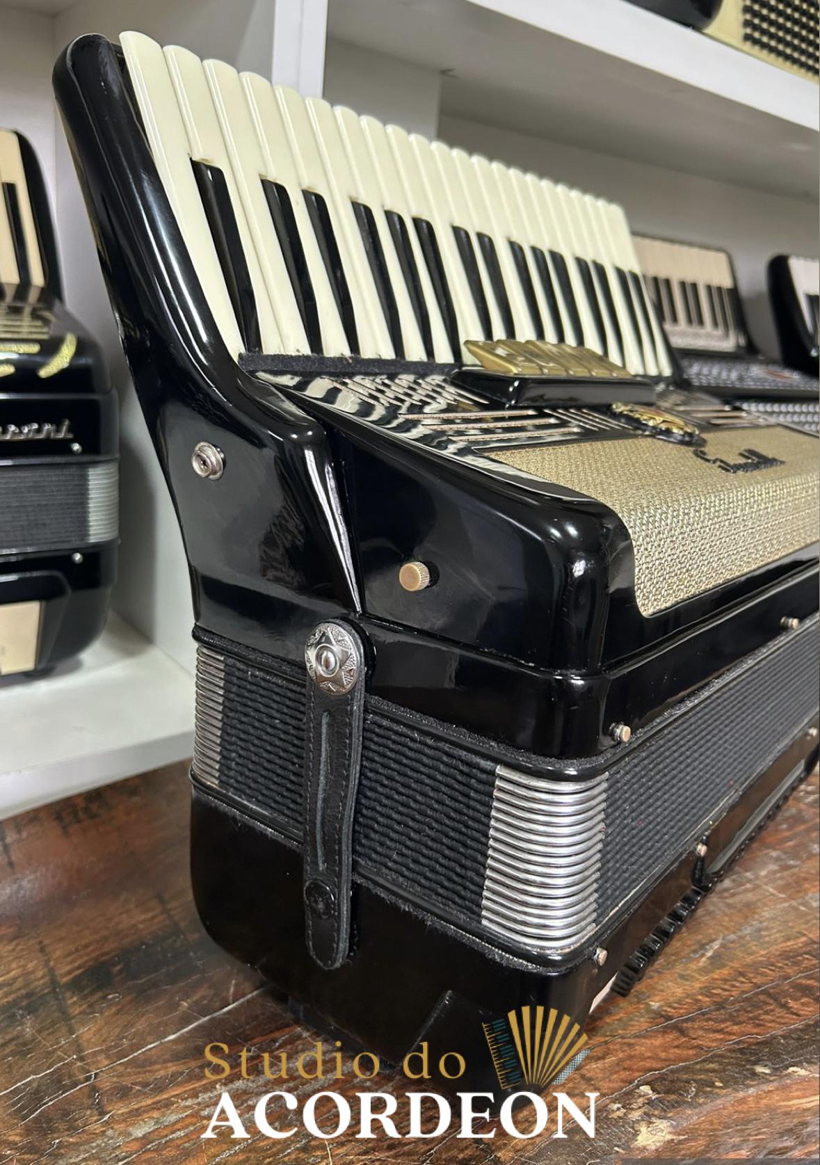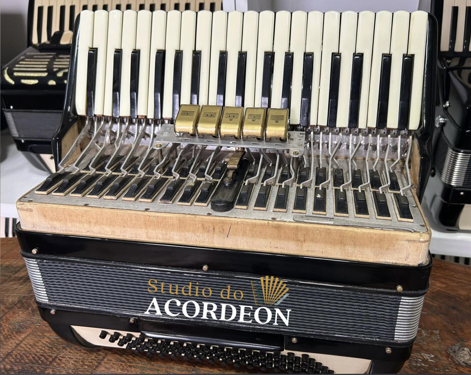 3/5 de voz com violino; 80 Baixos; 5/2 Registros; Modelo anos 50, série ouro; Fole e afinação 💯%; Teclado marfim; Frete grátis para todo Brasil para pagamento à vista; Parcelamos em até 12X nos cartões 💳