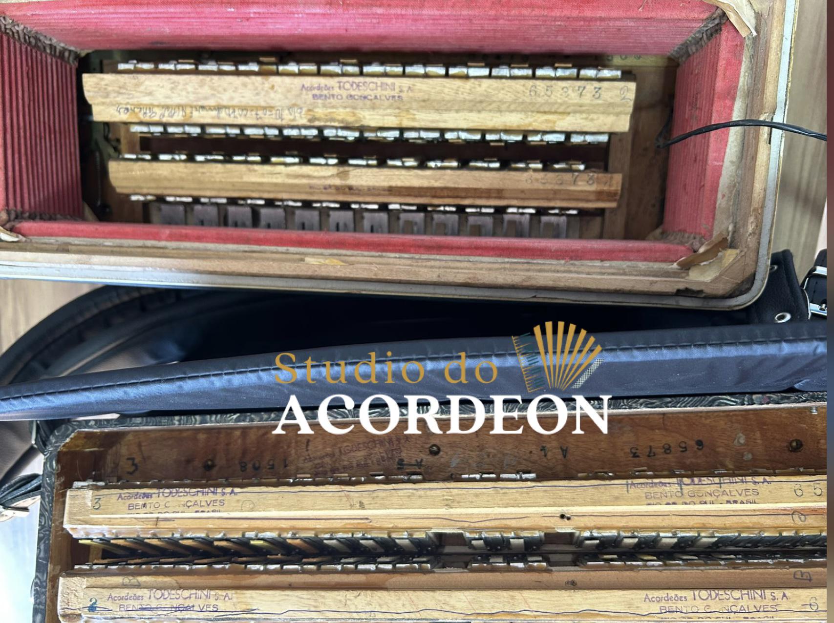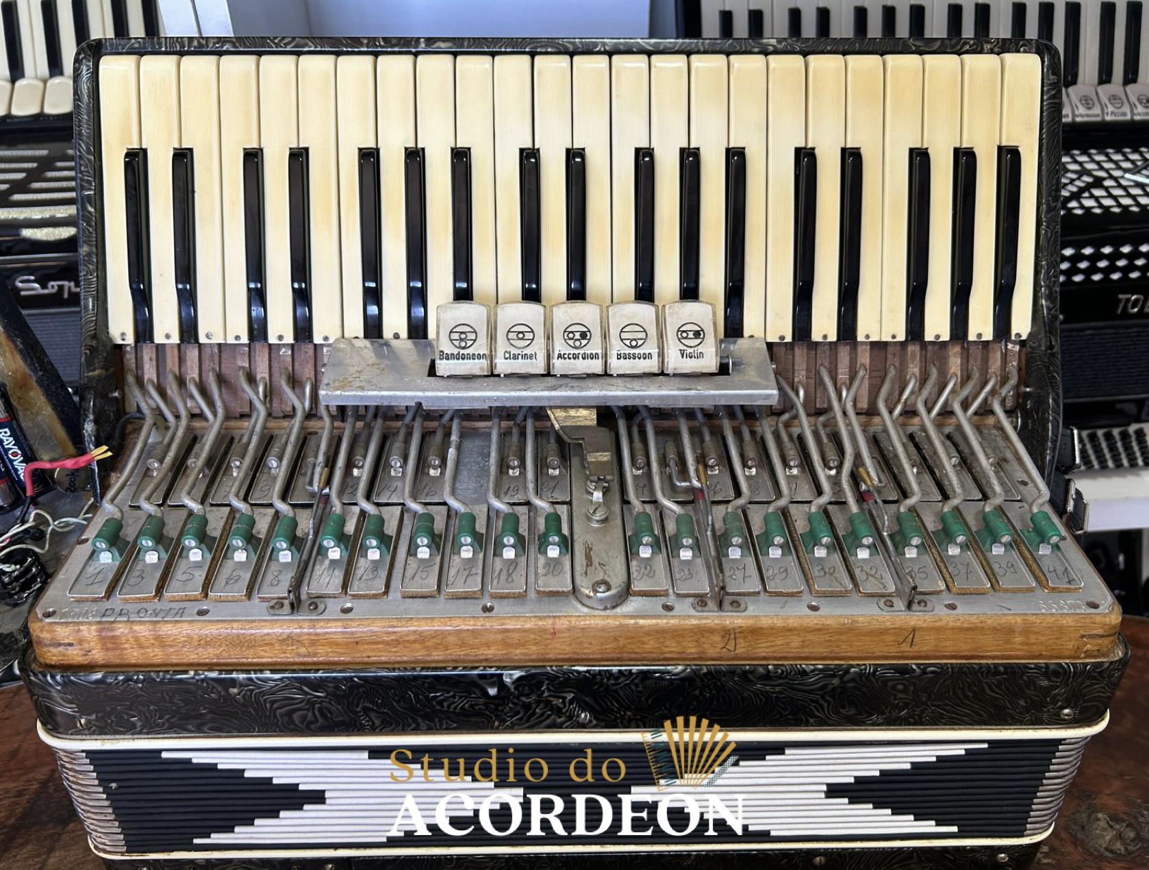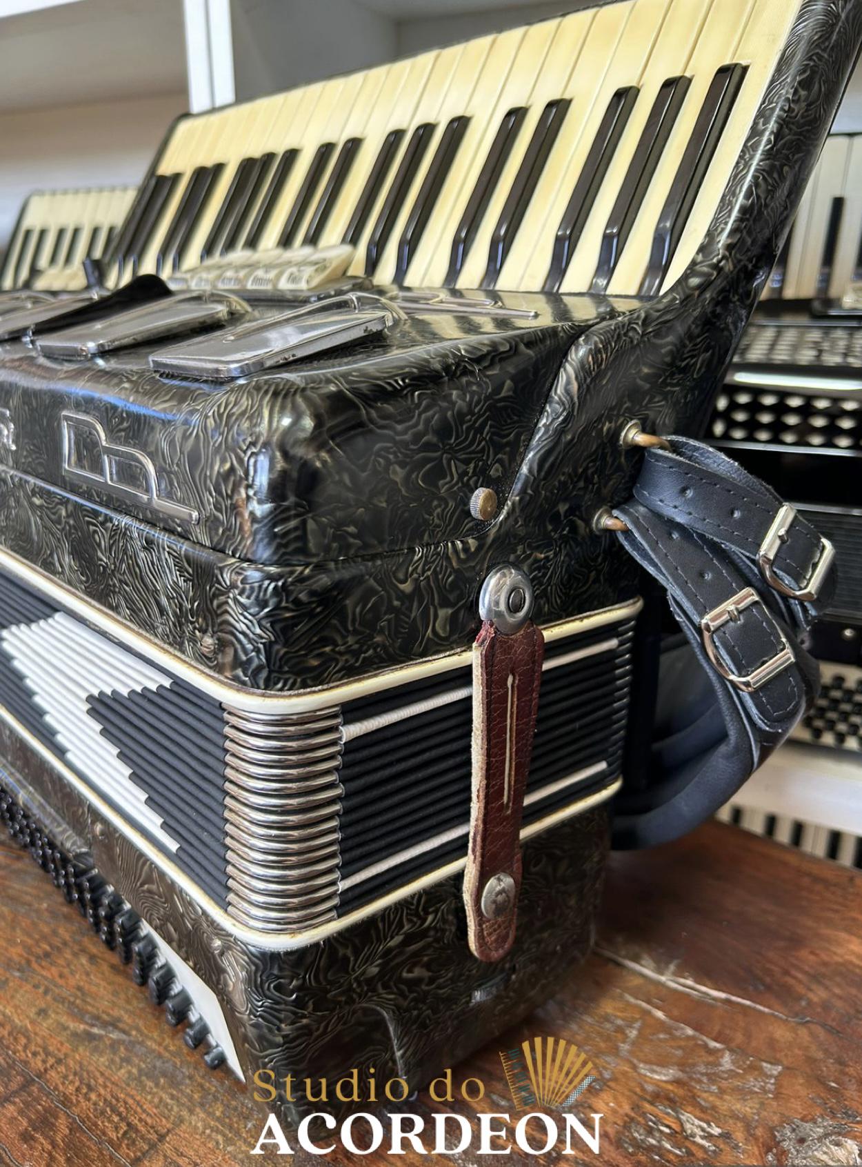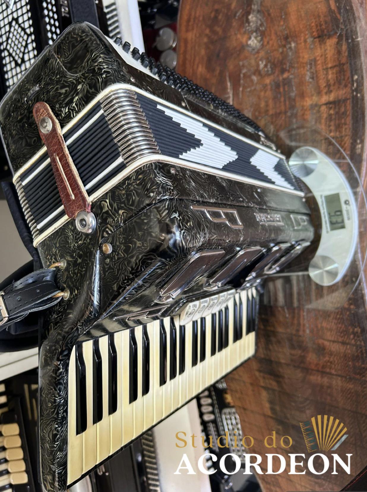 5/2 registros; 3/5 de voz; Anos 60 Selo verde e astes redondas; 120 Baixos; Eletrificada; Celulóide original e raro; Teclado marfim original; Aprox. 9.300kg; Timbre espetacular; Frete grátis para todo Brasil para pagamento à vista; Parcelamos em até 12X nos cartões 💳