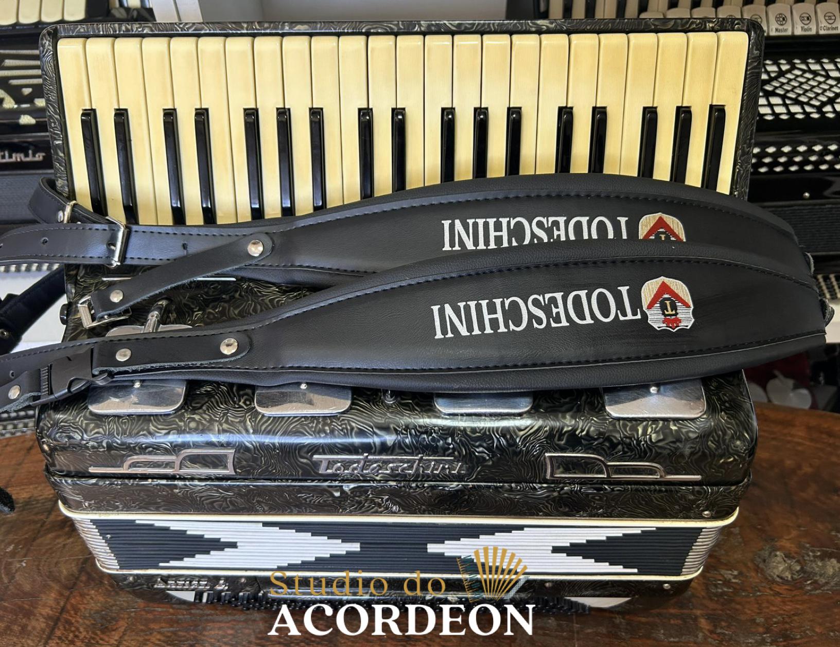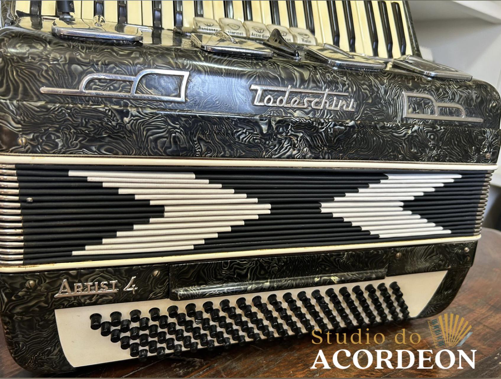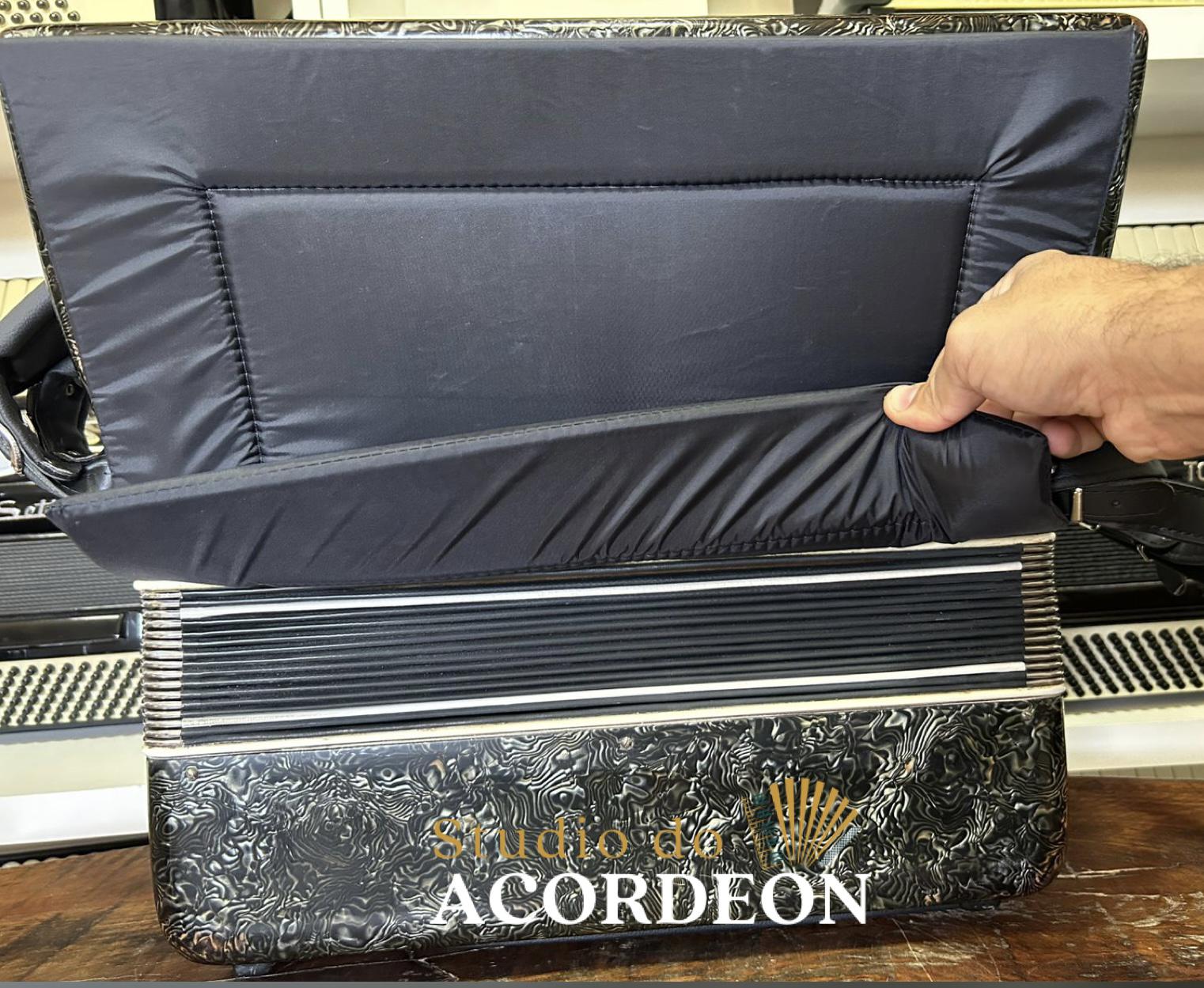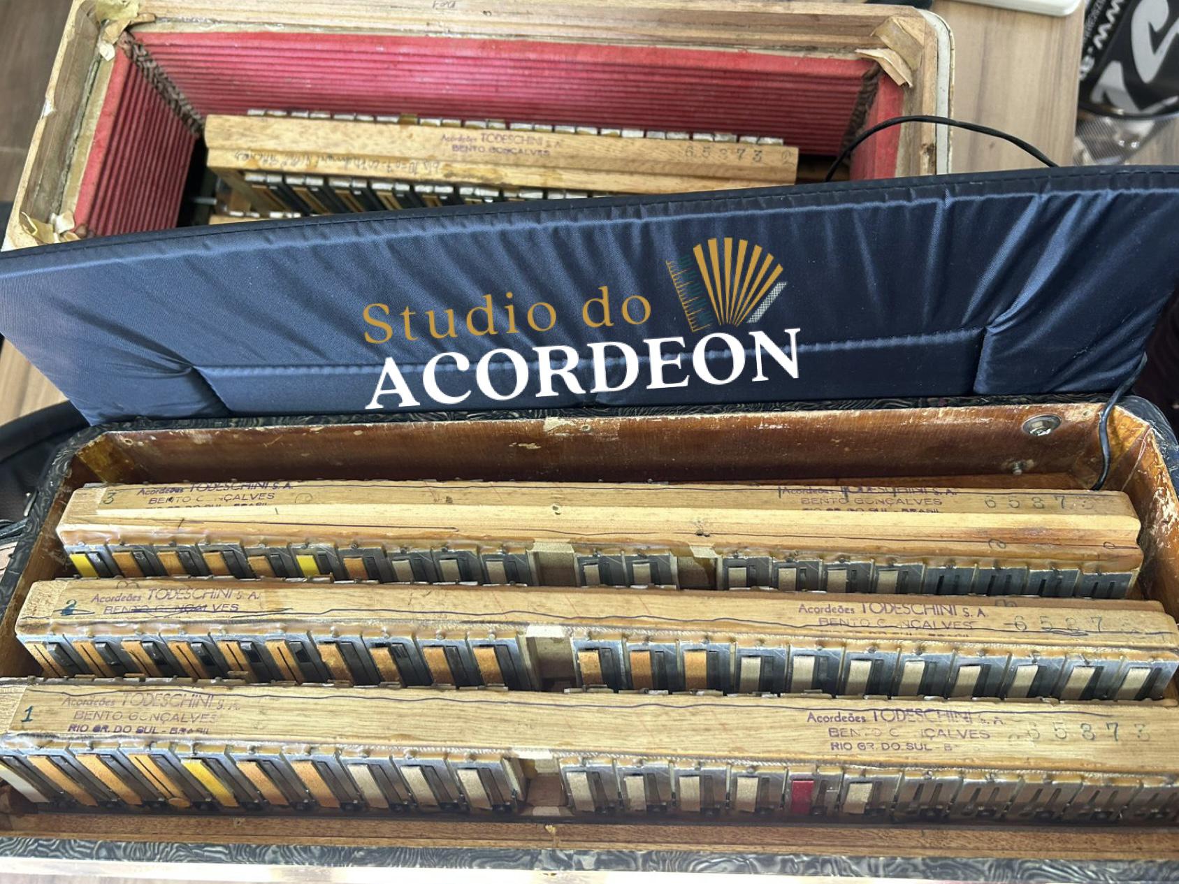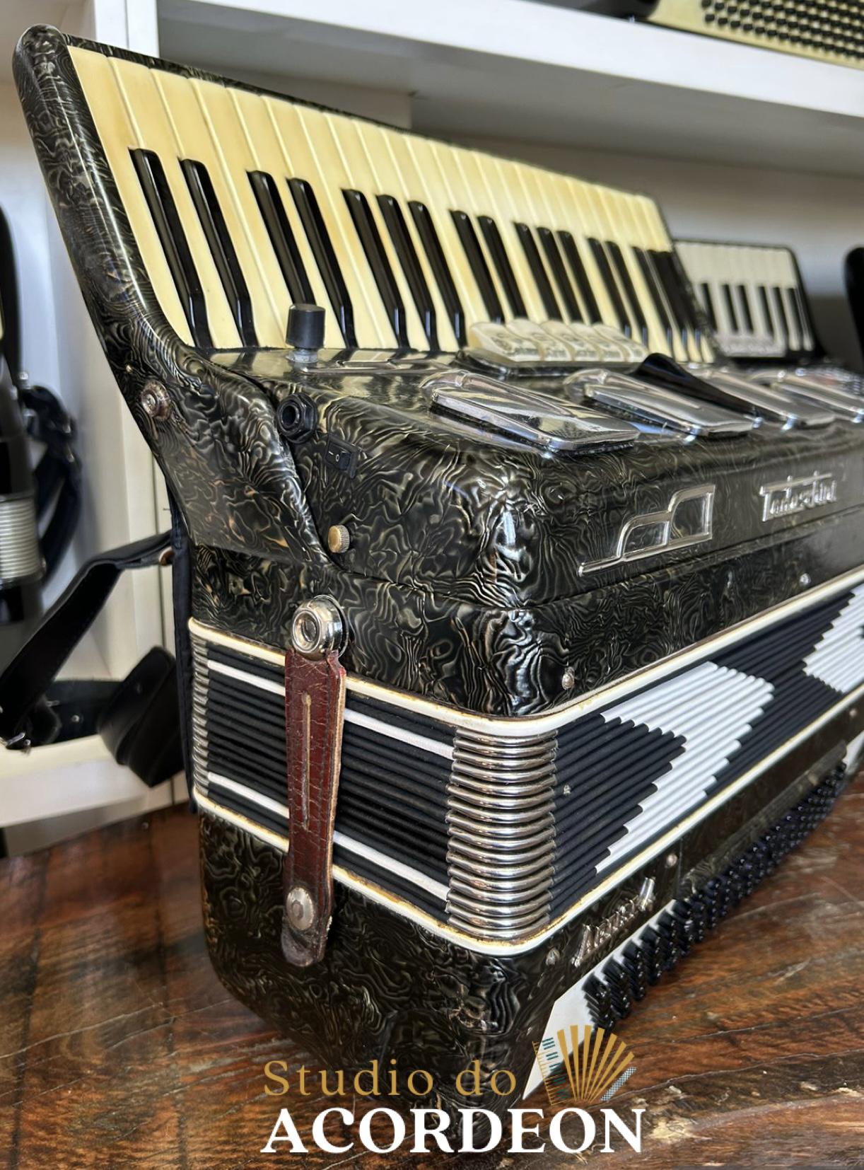 5/2 registros; 3/5 de voz; Anos 60 Selo verde e astes redondas; 120 Baixos; Eletrificada; Celulóide original e raro; Teclado marfim original; Aprox. 9.300kg; Timbre espetacular; Frete grátis para todo Brasil para pagamento à vista; Parcelamos em até 12X nos cartões 💳