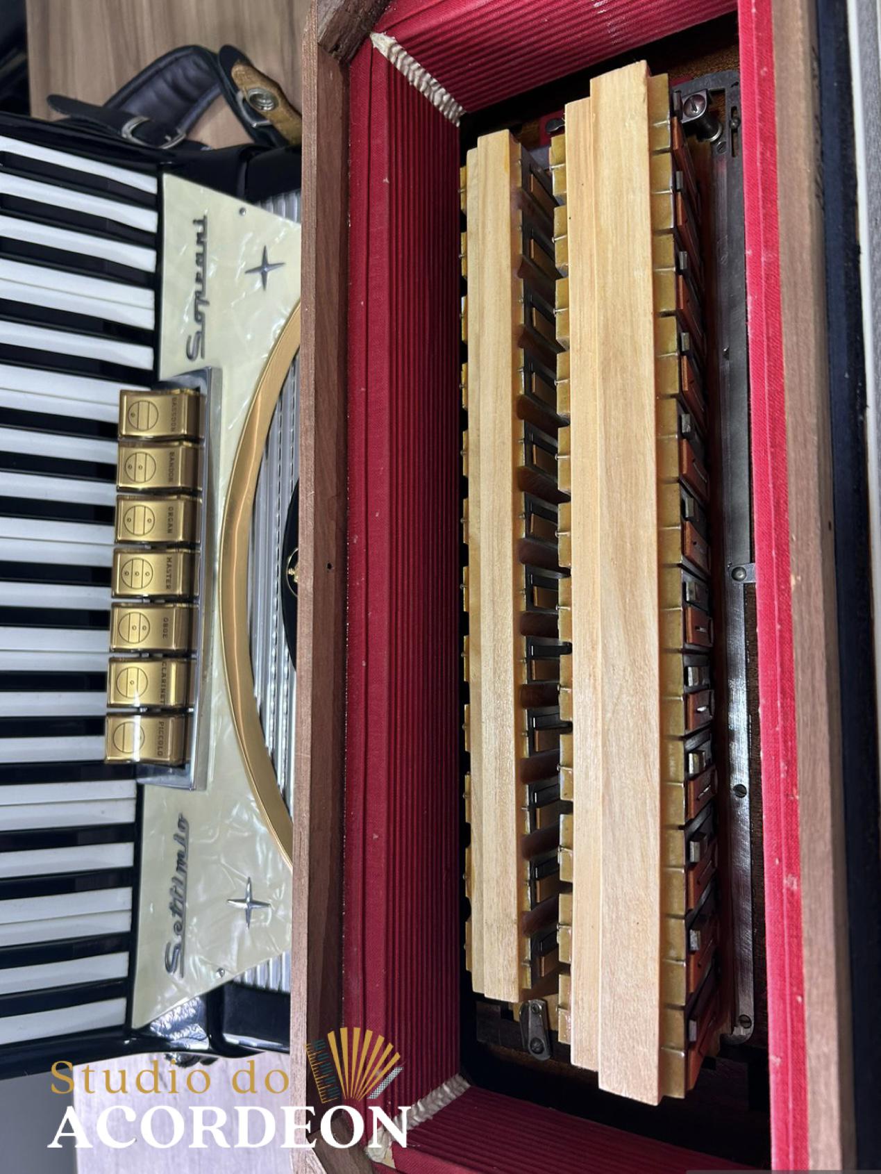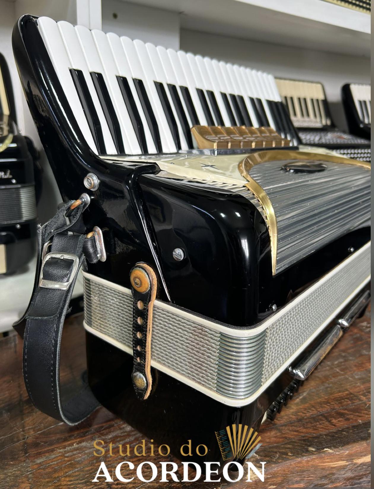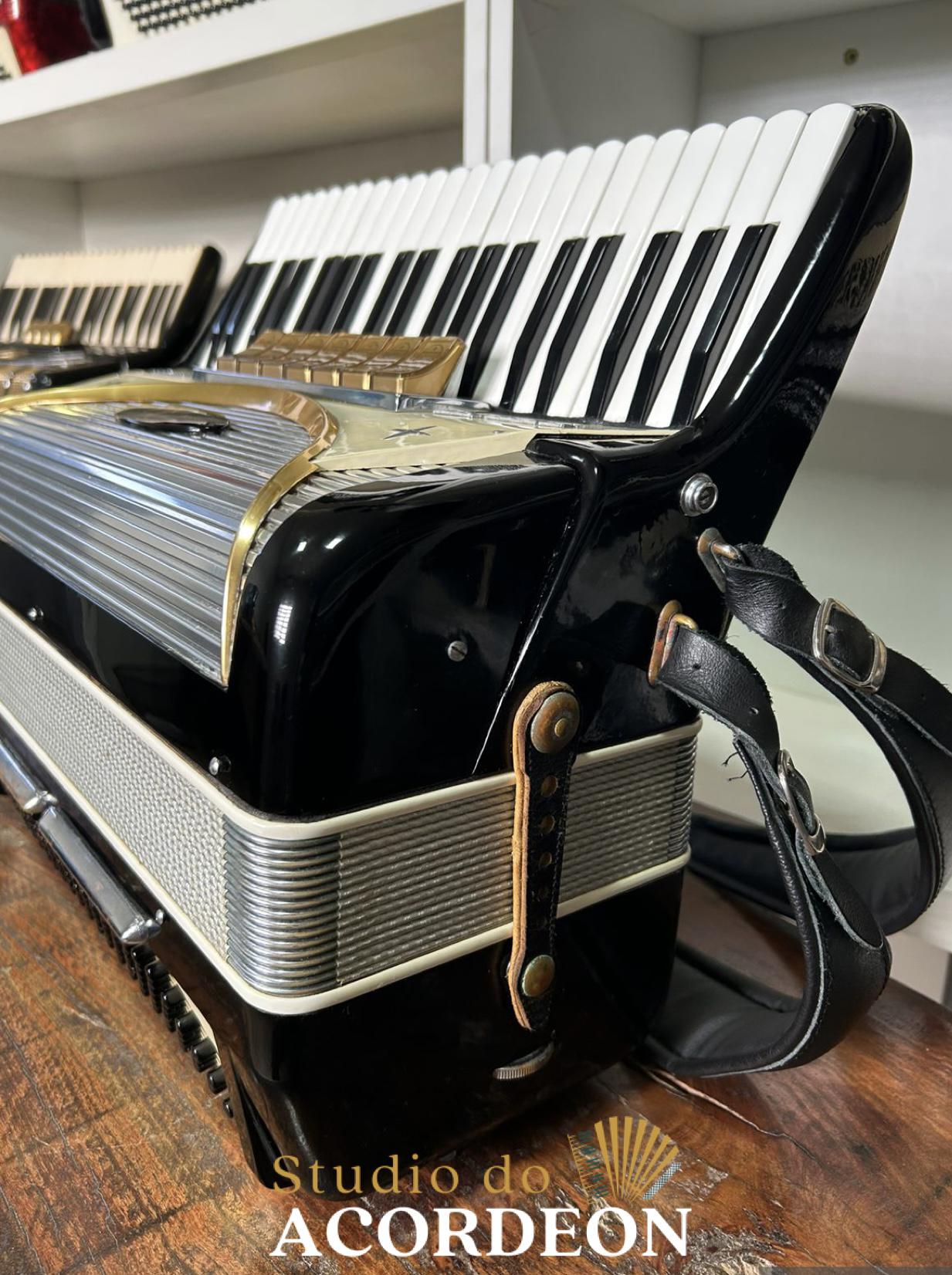 7/2 registros; 3/5 oitavada de fábrica; Lacrada, nunca furada com eletrificações; 120 Baixos; Fole e afinação 💯%; Timbre espetacular; Frete grátis para todo Brasil para pagamento à vista; Parcelamos em até 12X nos cartões 💳