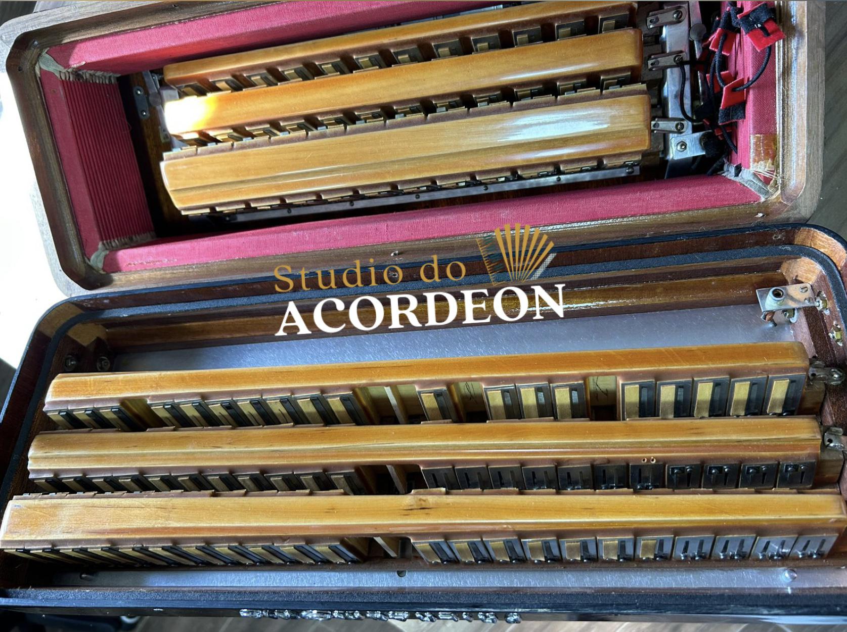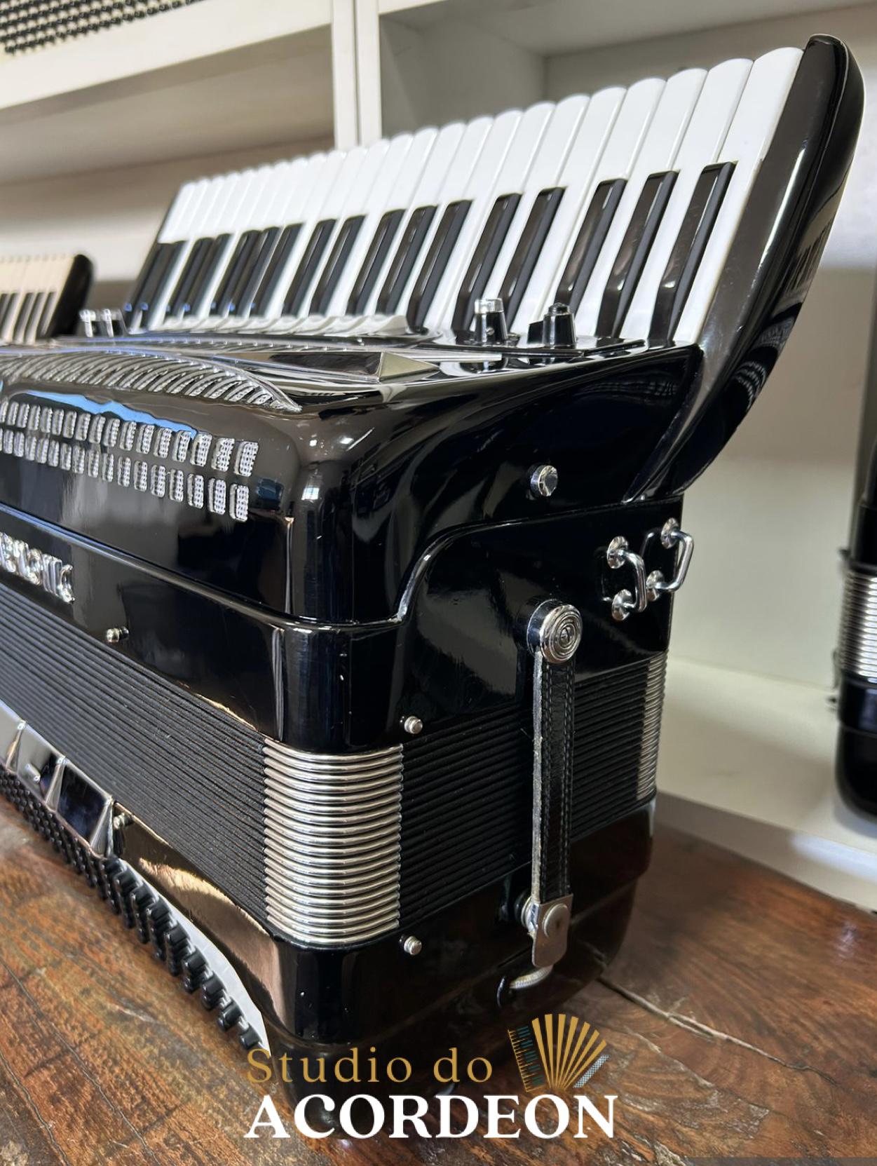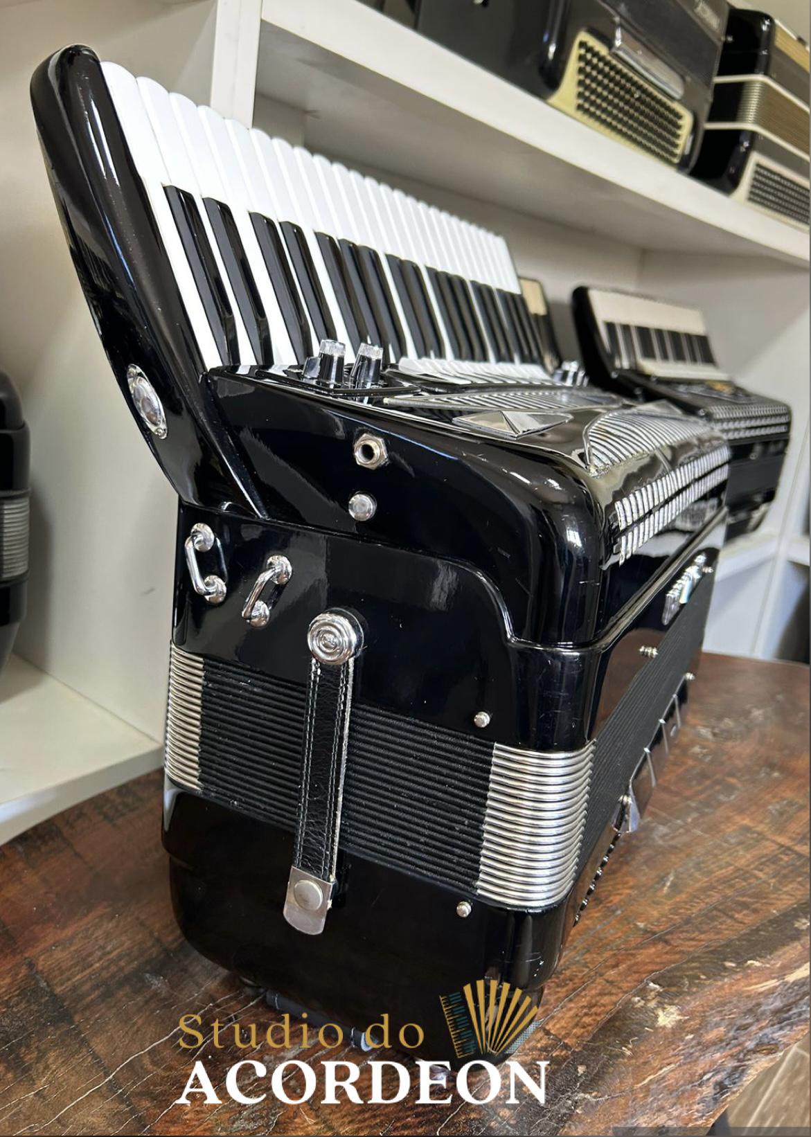 Teclado tamanho profissional com 49cm; 7/4 registros; 3/5 oitavada de fábrica; Desarme Lateral; Simulador de Cassoto; 120 Baixos; Fole e afinação 💯%; Timbre espetacular; Frete grátis para todo Brasil para pagamento à vista; Parcelamos em até 12X nos cartões 💳